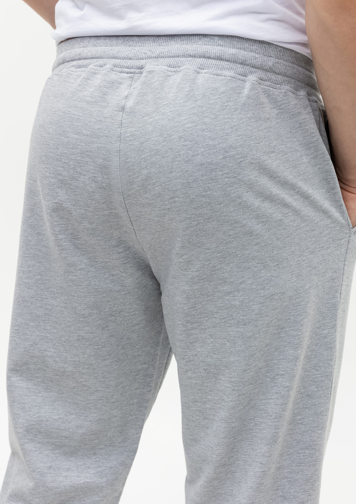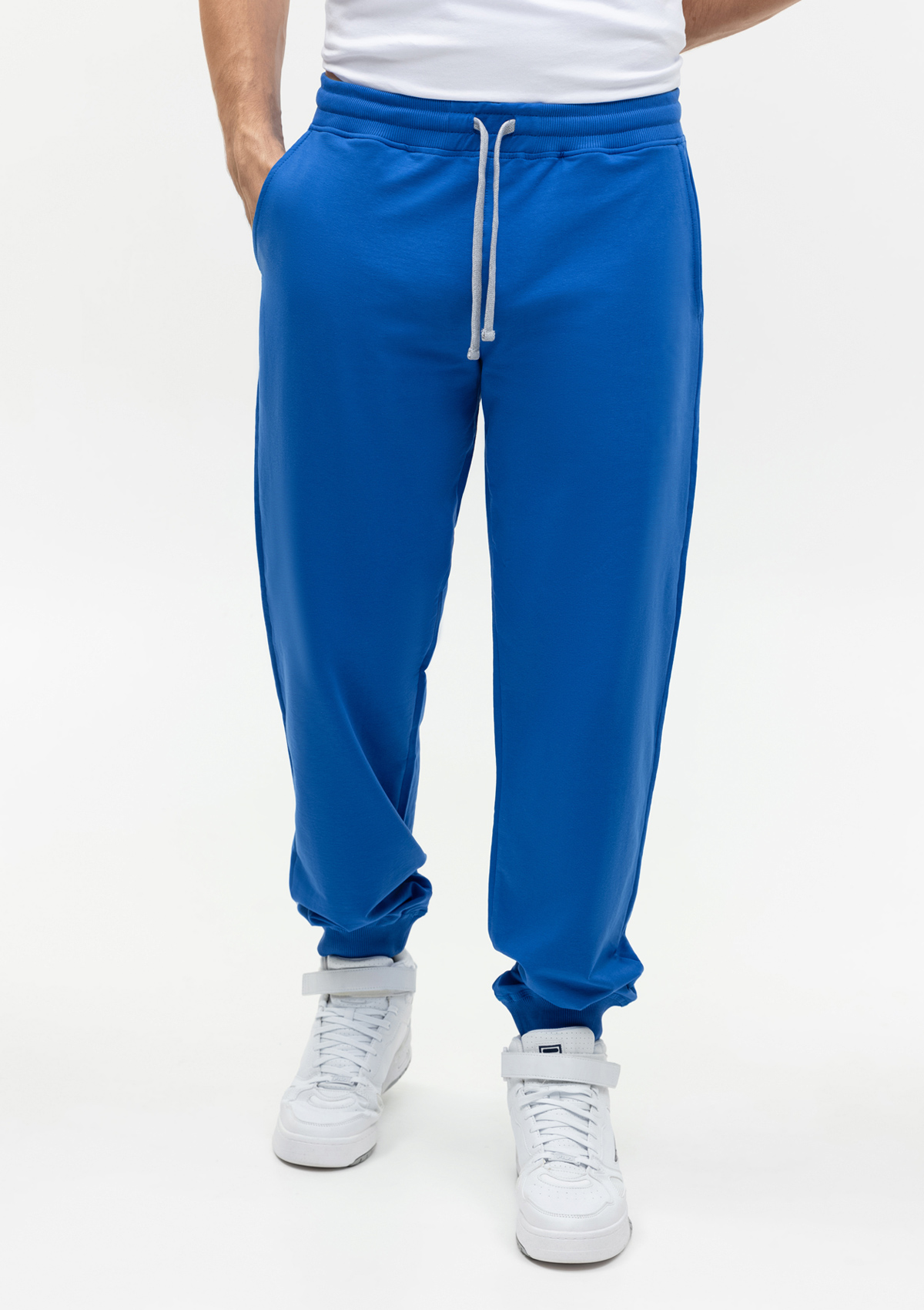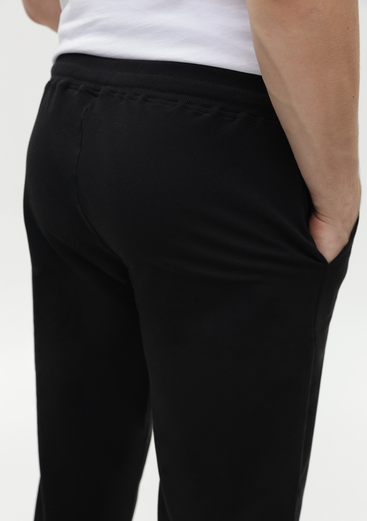 Мужские брюки свободного силуэта с широким эластичным поясом-кулисой и прорезным карманом.