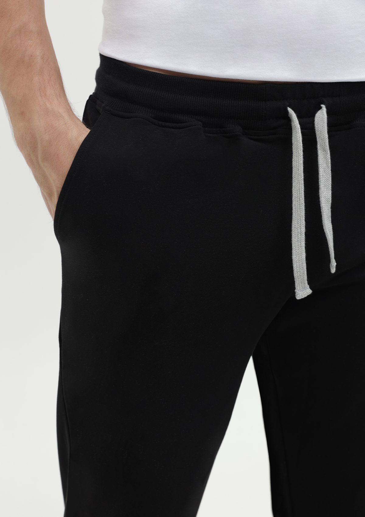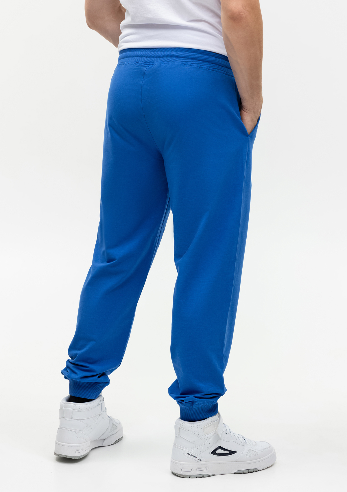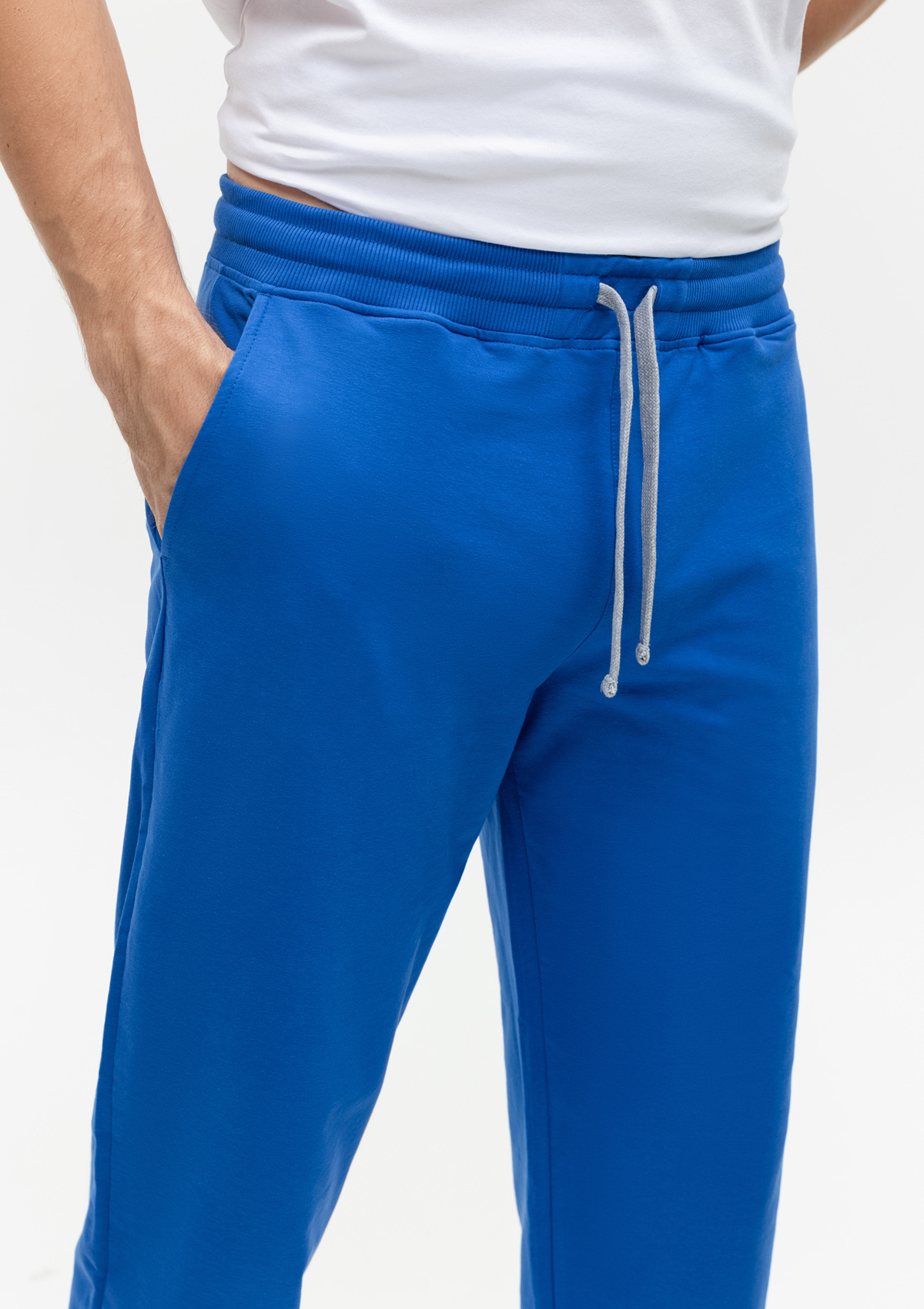Мужские брюки свободного силуэта с широким эластичным поясом-кулисой и прорезным карманом.