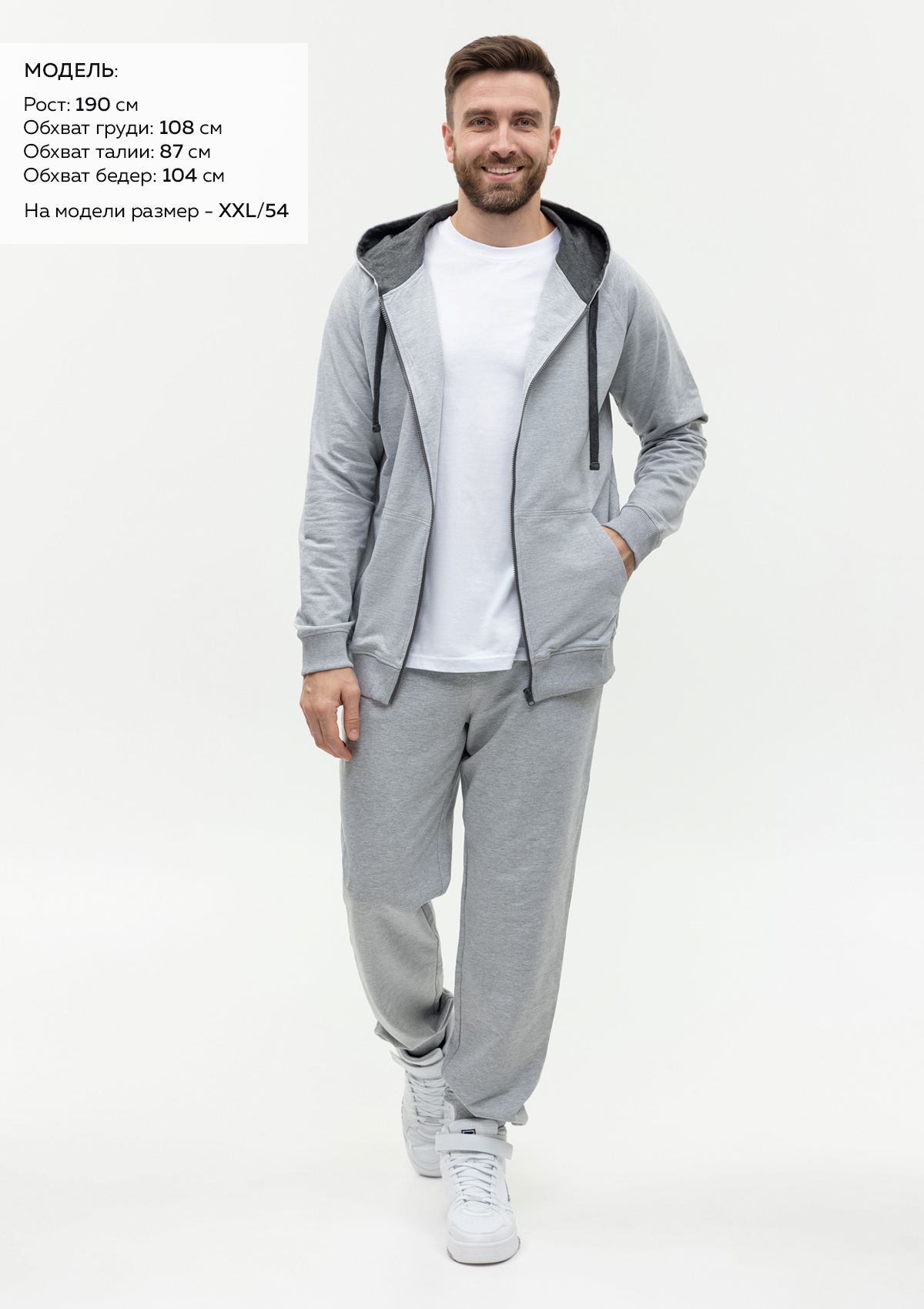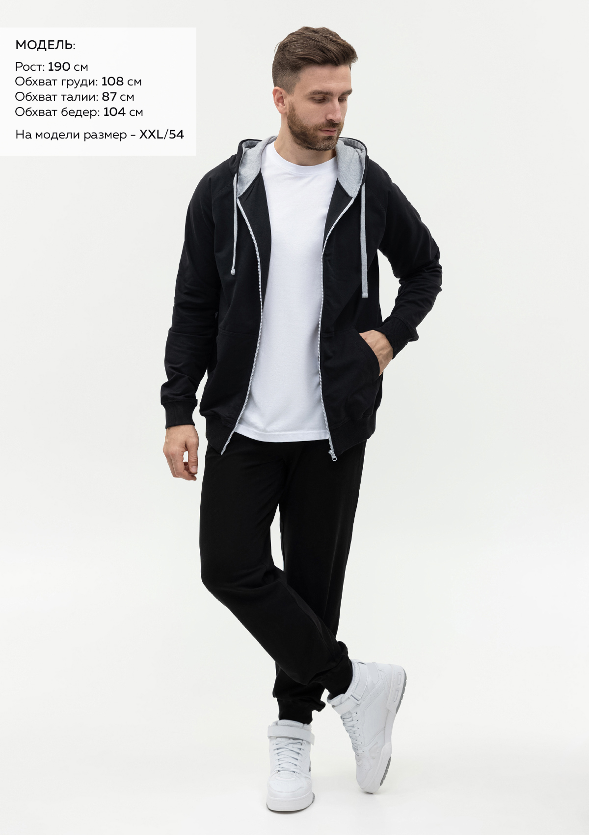 Размер на модели: XXL/54. Параметры модели: рост 190 см.; обхват груди 108 см.; обхват талии 87 см.; обхват бедер 104 см.