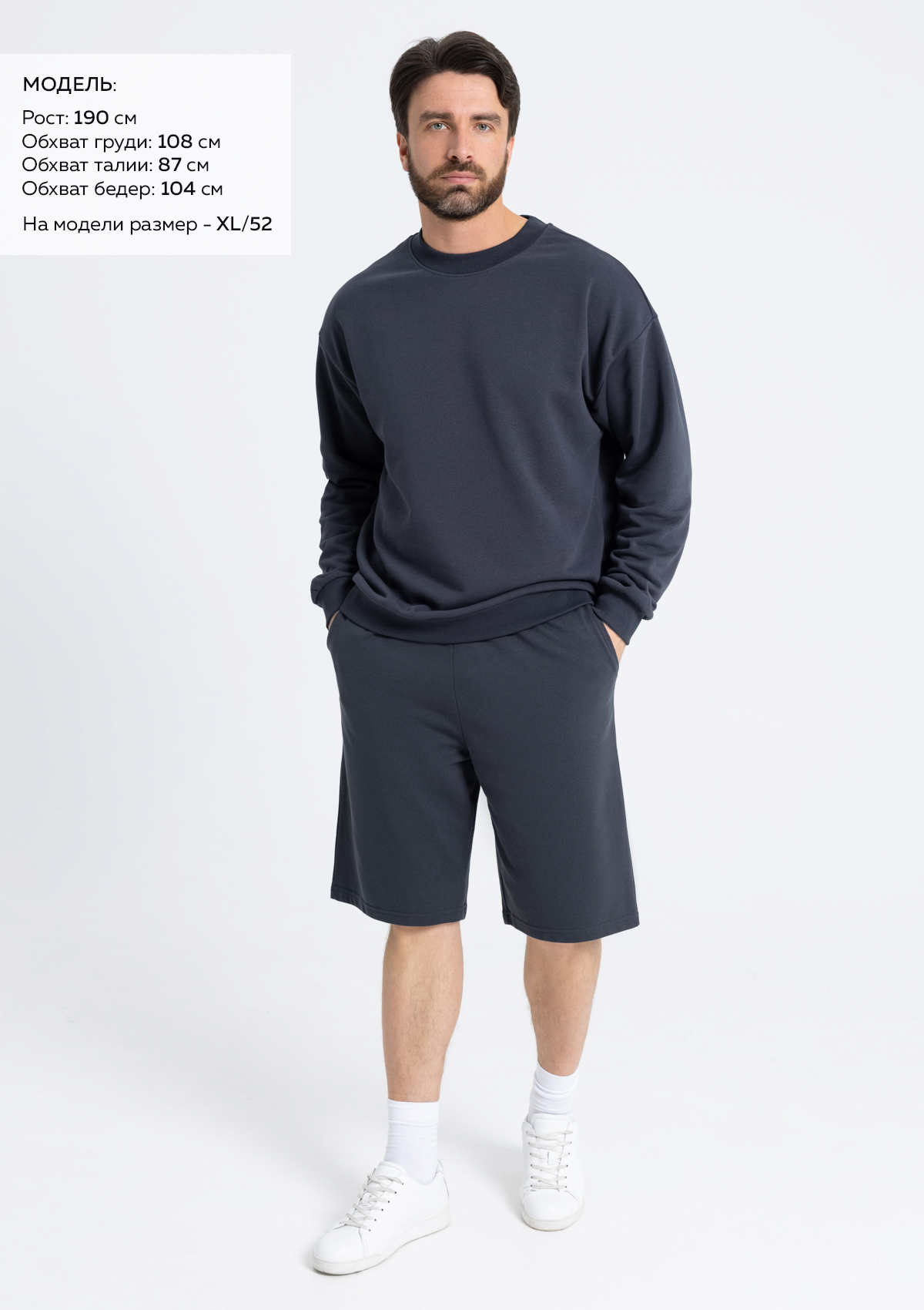 Размер на модели: XL/52. Параметры модели: рост 190 см.; обхват груди 108 см.; обхват талии 87 см.; обхват бедер 104 см.