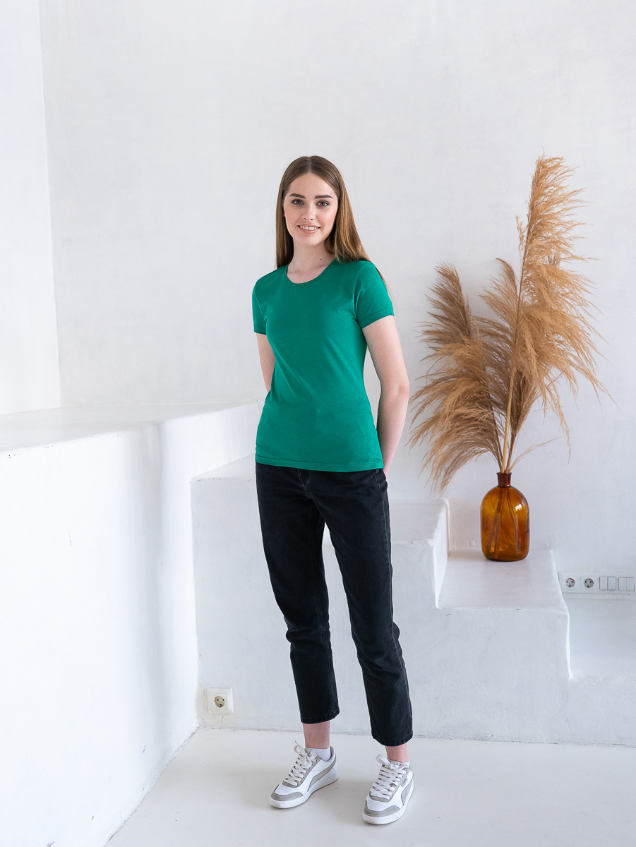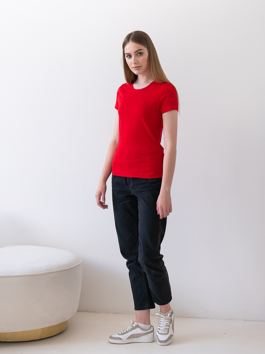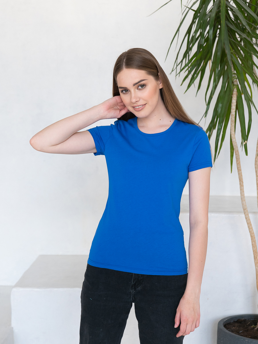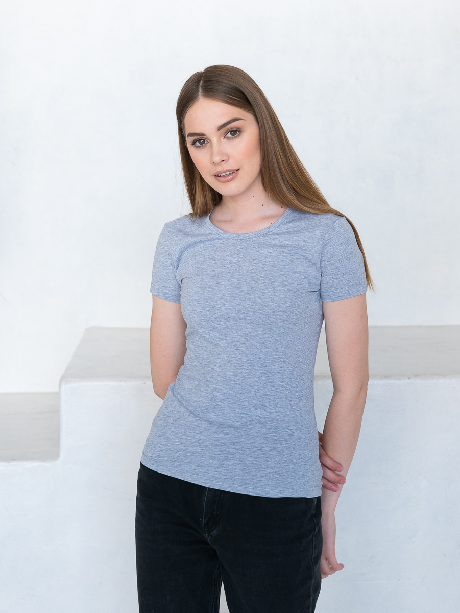 Женская футболка приталенного силуэта с округлым воротом и втачным рукавом.