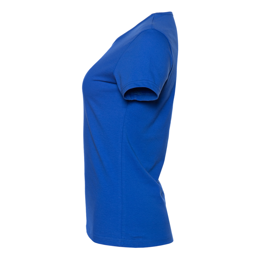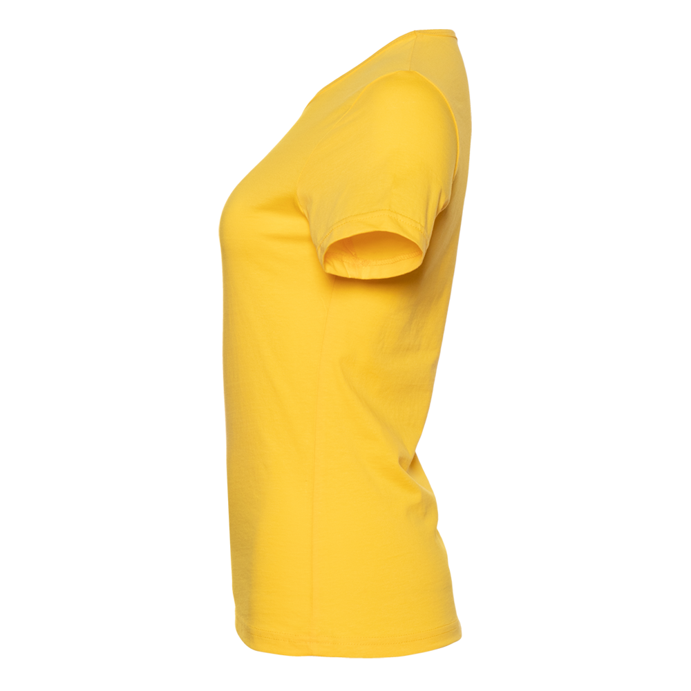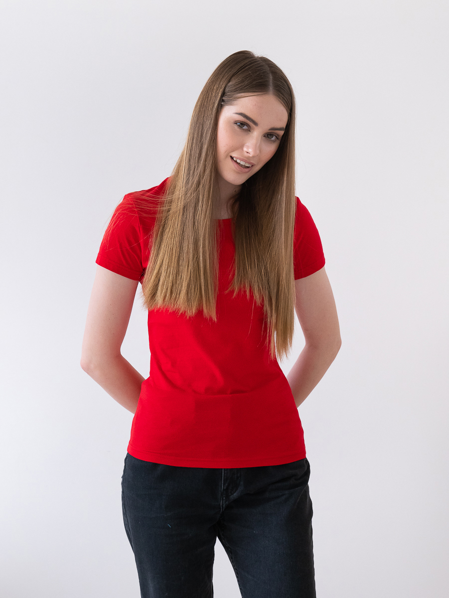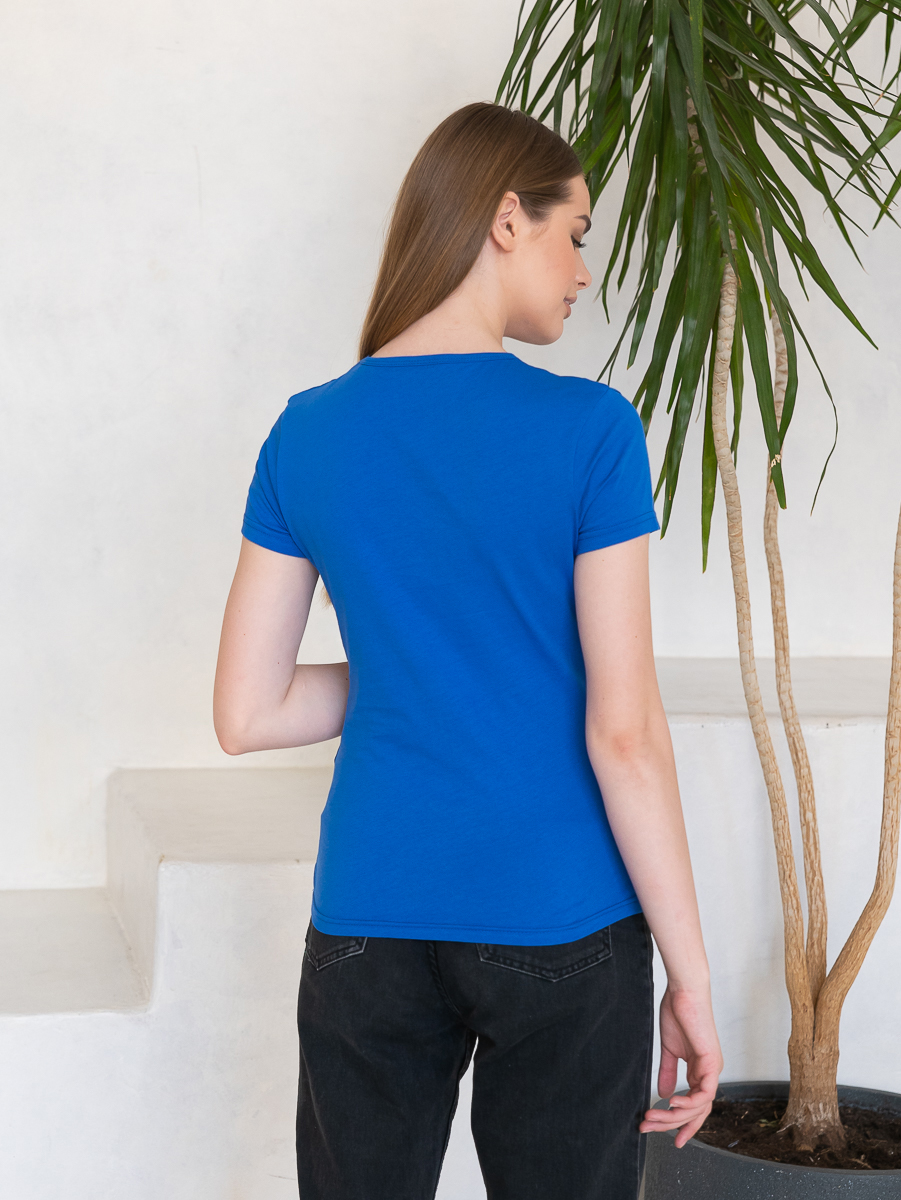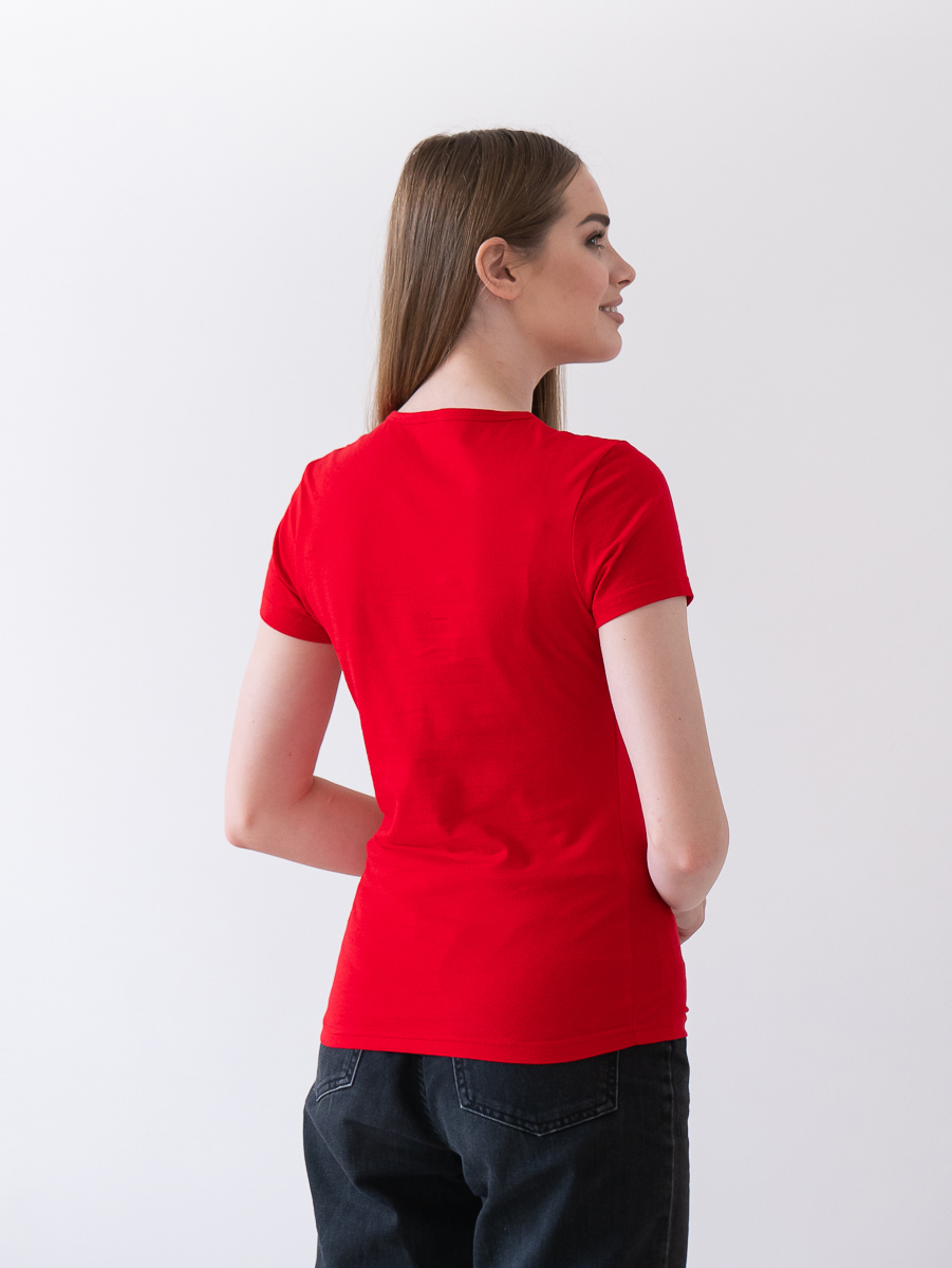 Женская футболка приталенного силуэта с округлым воротом и втачным рукавом.