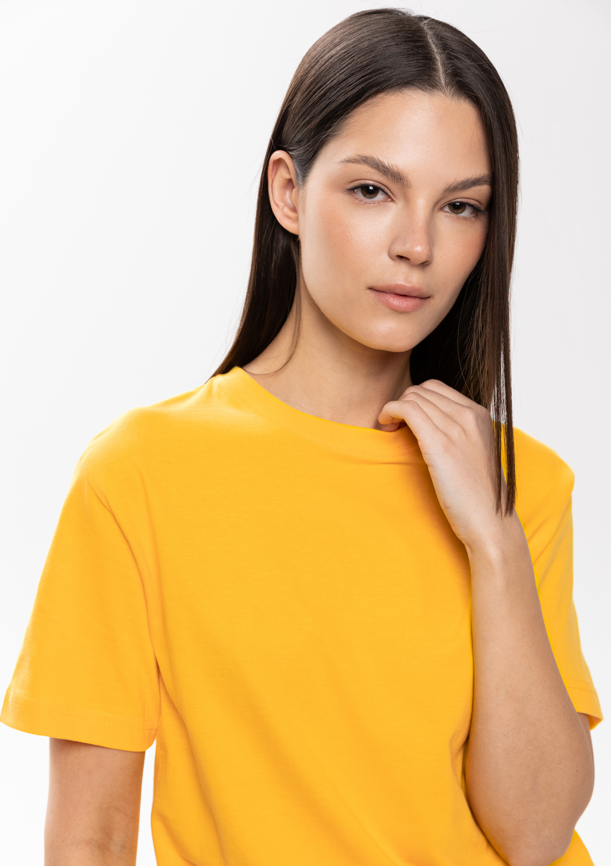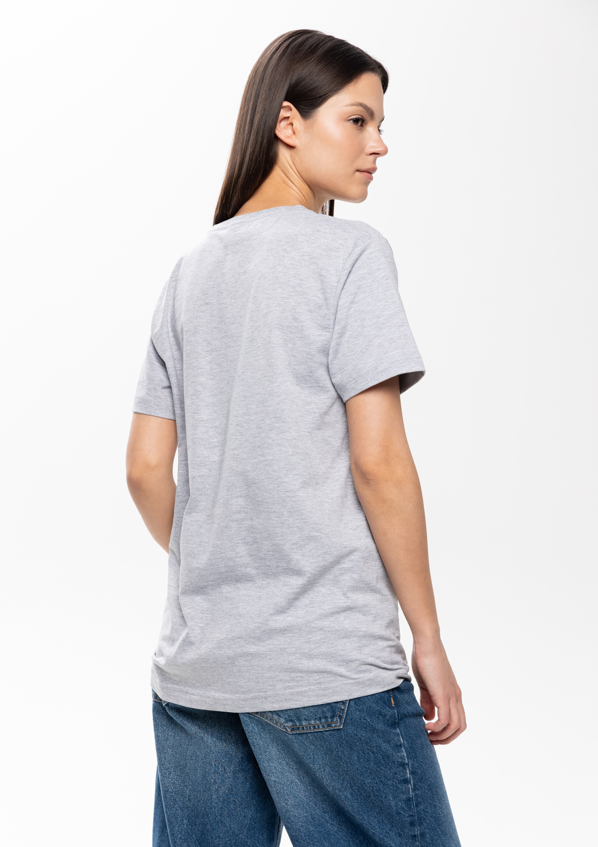 Размер женской футболки: S/46. Параметры модели: рост 173 см.; обхват груди 80 см.; обхват талии 58 см.; обхват бедер 89 см.