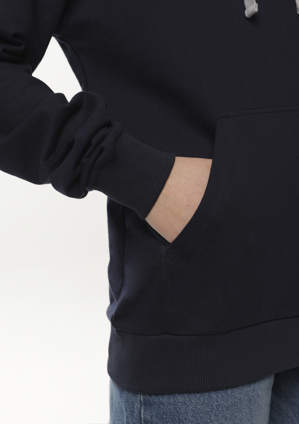 Толстовка прямого силуэта с капюшоном, втачным рукавом и карманом-кенгуру. Капюшон дополнен шнурком для регулирования прилегания, манжет и низ изделия оформлены широкой эластичной резинкой. Возможно два варианта исполнения: контрастные шнурок и бейка/шнурок и бейка в цвет толстовки.