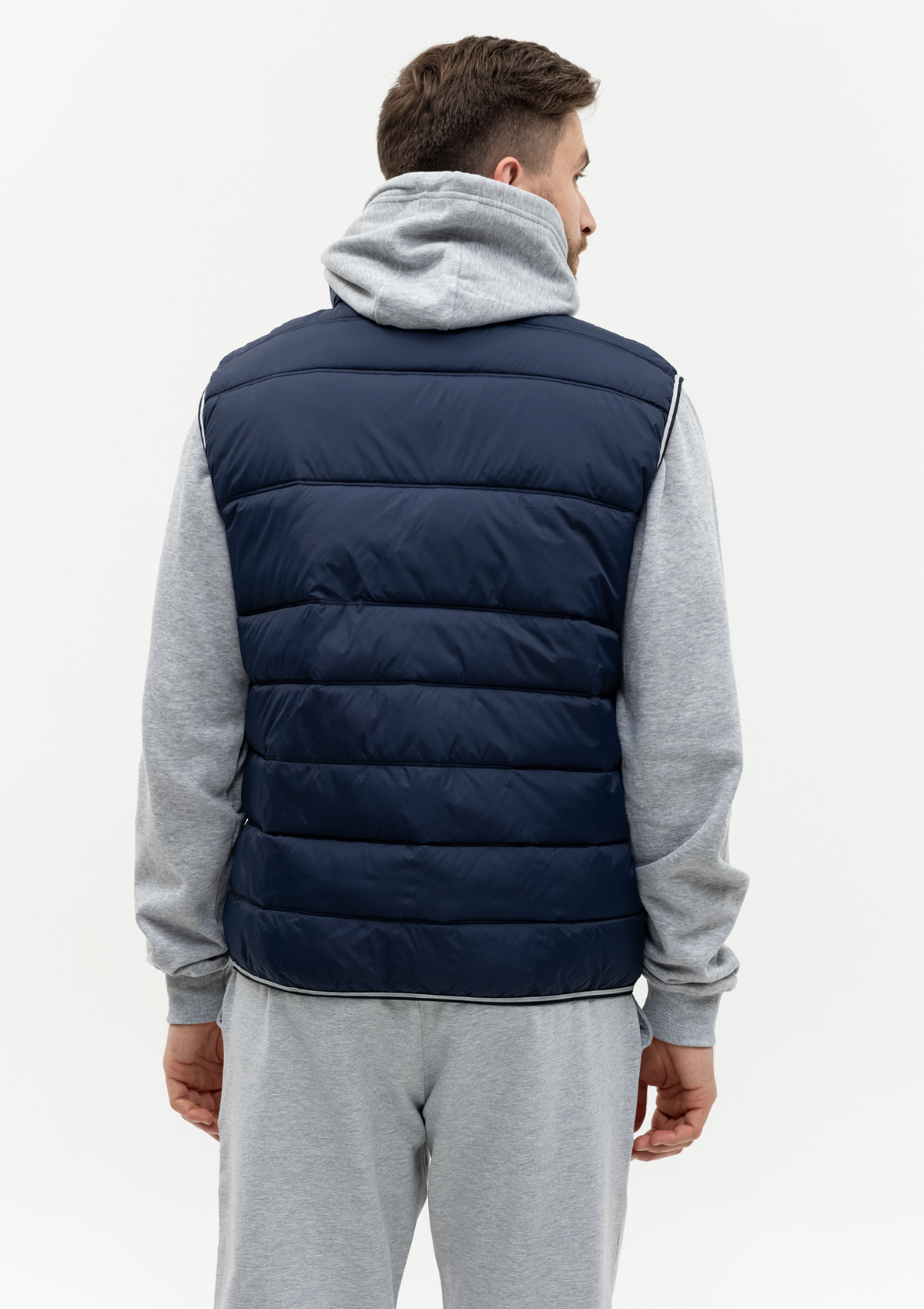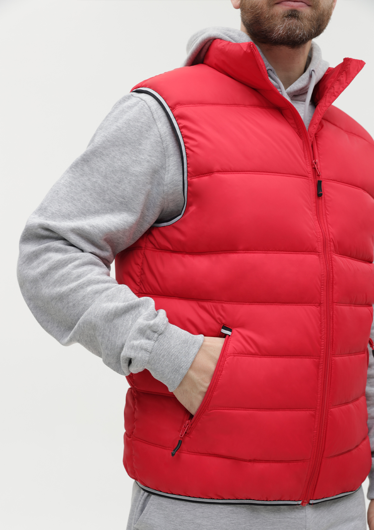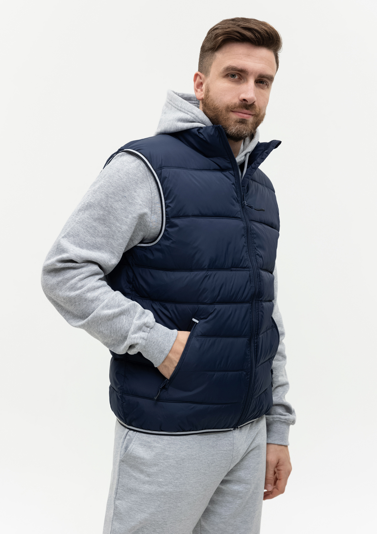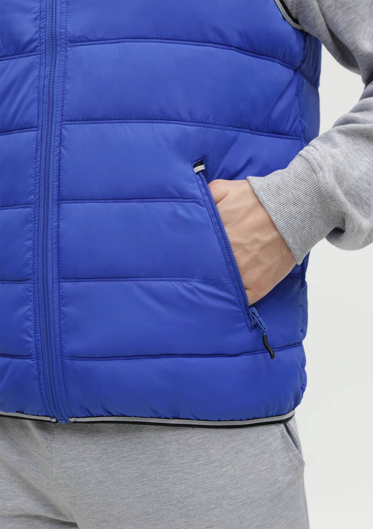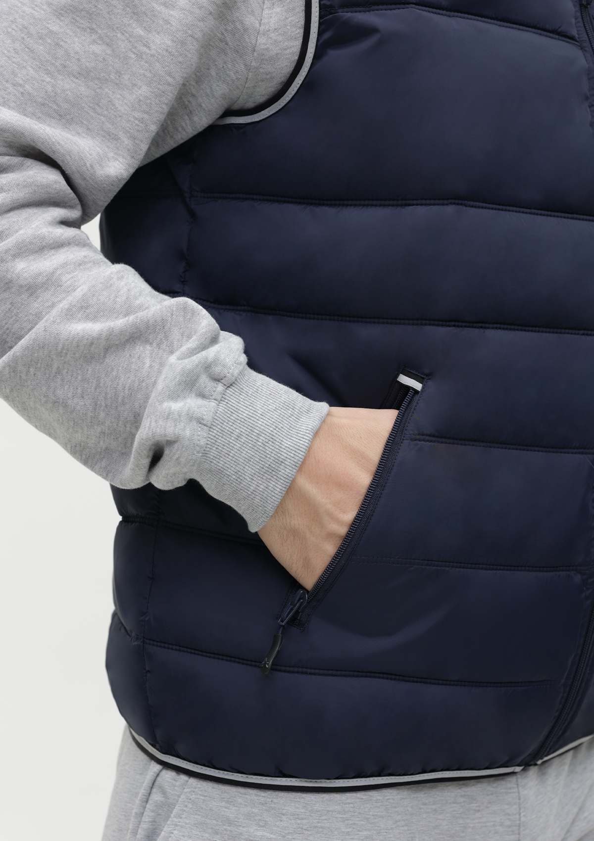 Мужской жилет прямого силуэта с геометричной стежкой, воротником-стойкой, прорезным карманом и застежкой на молнию. Изделие дополнено контрастной резинкой по пройме и линии низа для дополнительной защиты от холода и ветра.
