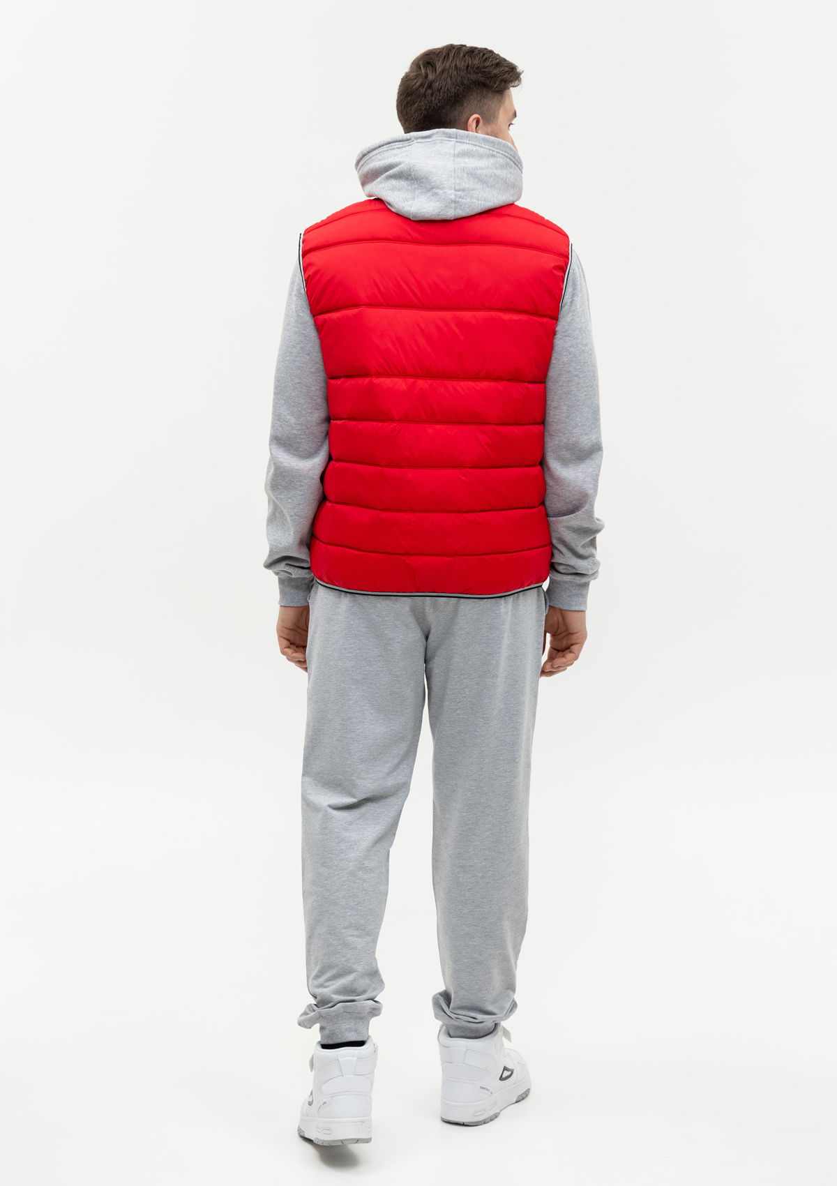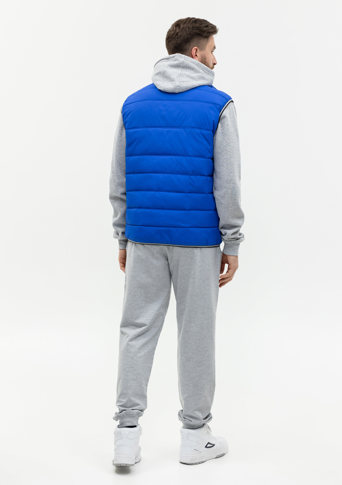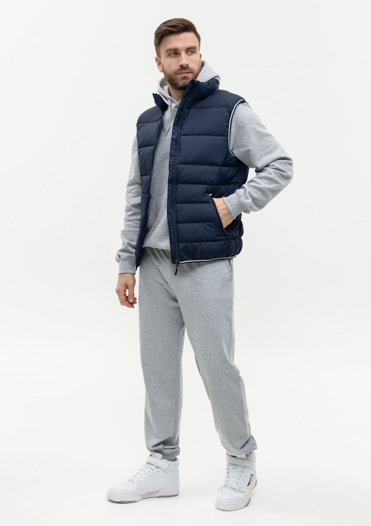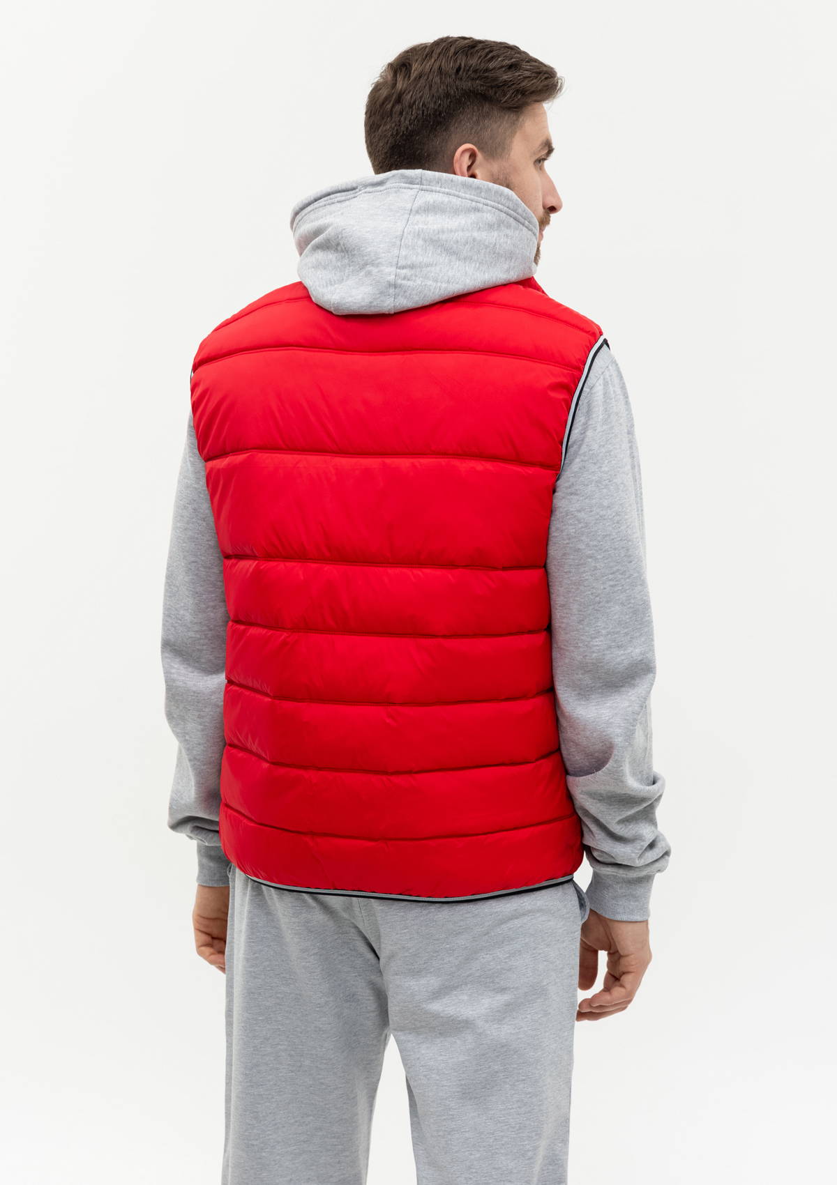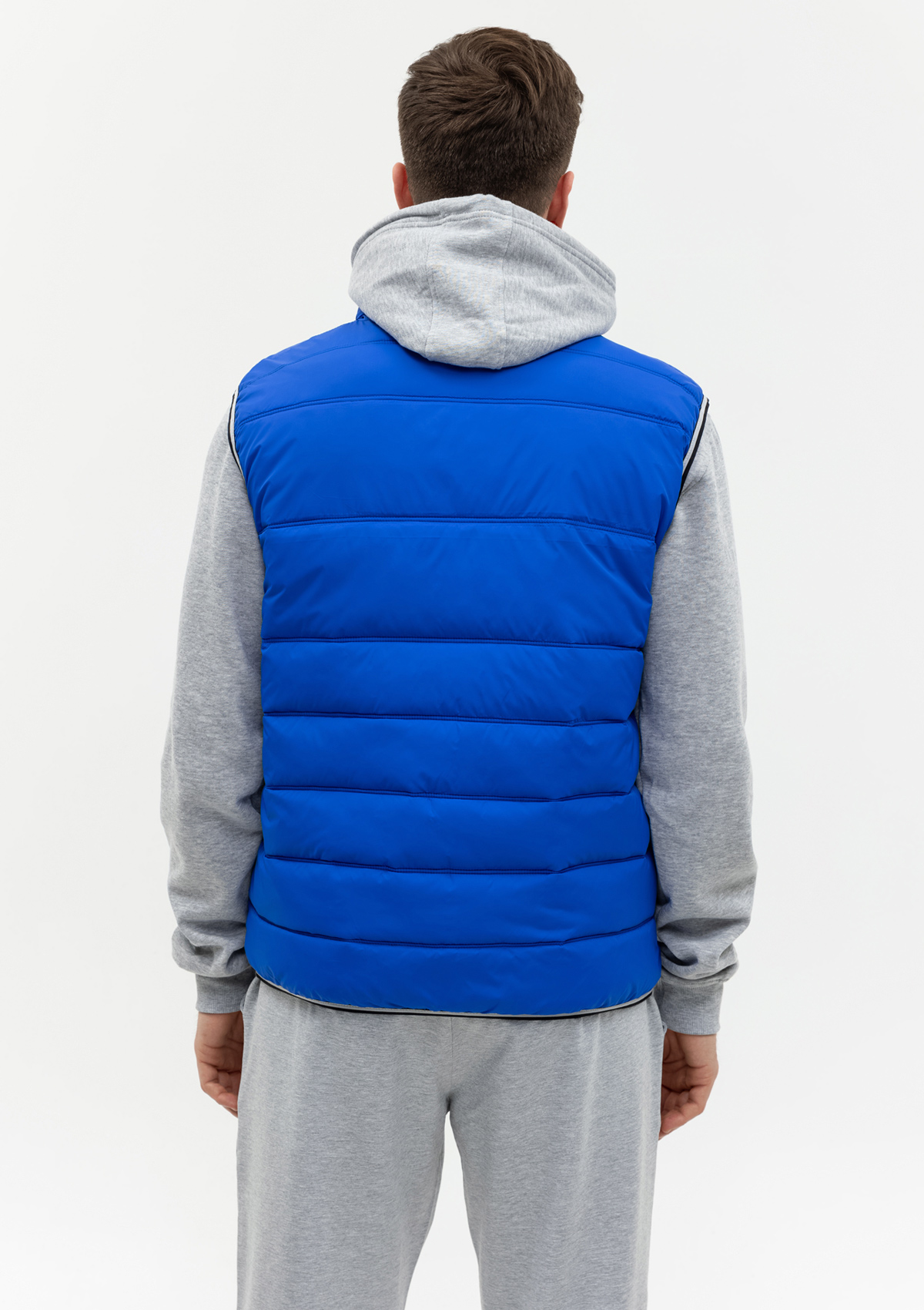 Мужской жилет прямого силуэта с геометричной стежкой, воротником-стойкой, прорезным карманом и застежкой на молнию. Изделие дополнено контрастной резинкой по пройме и линии низа для дополнительной защиты от холода и ветра.