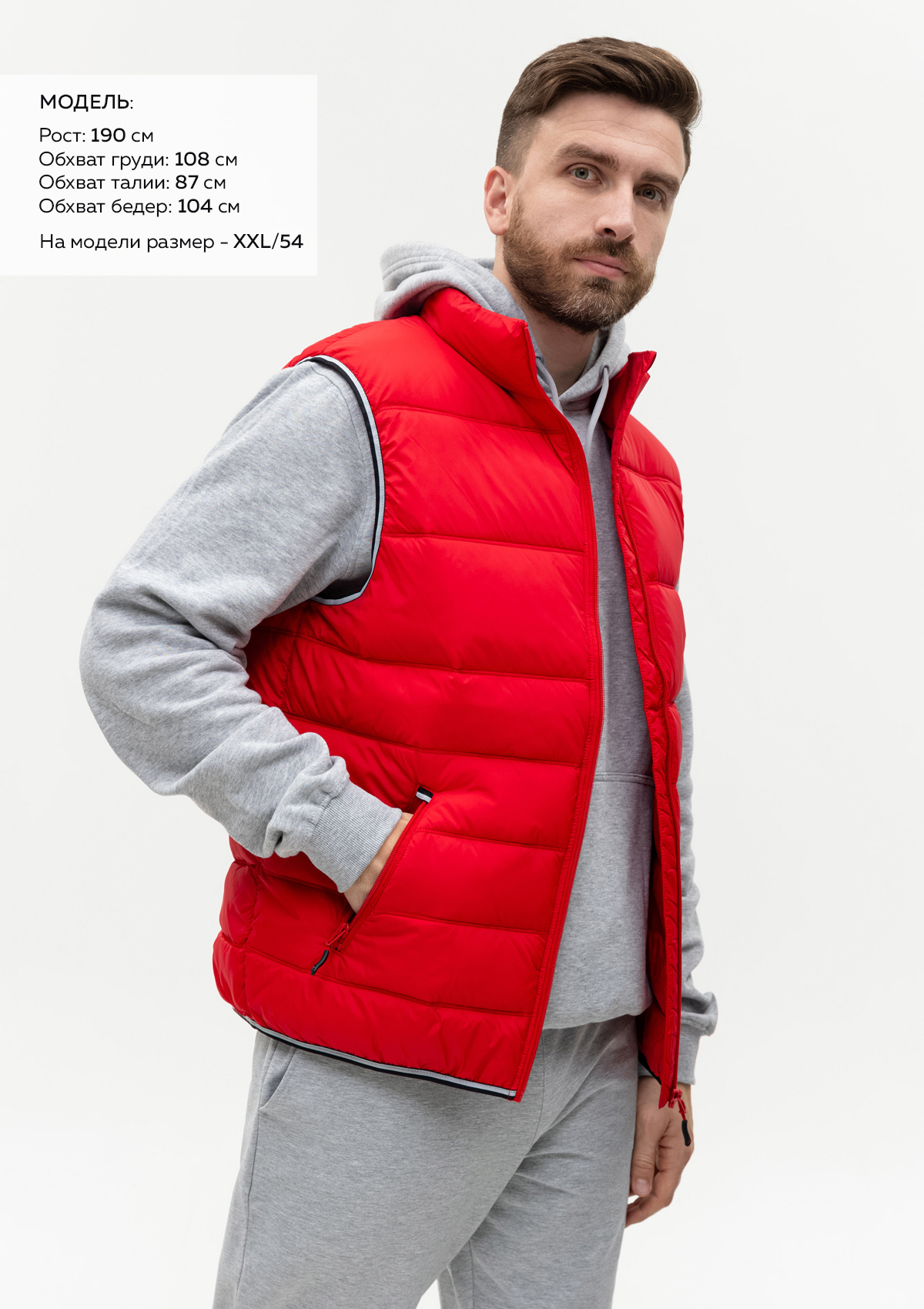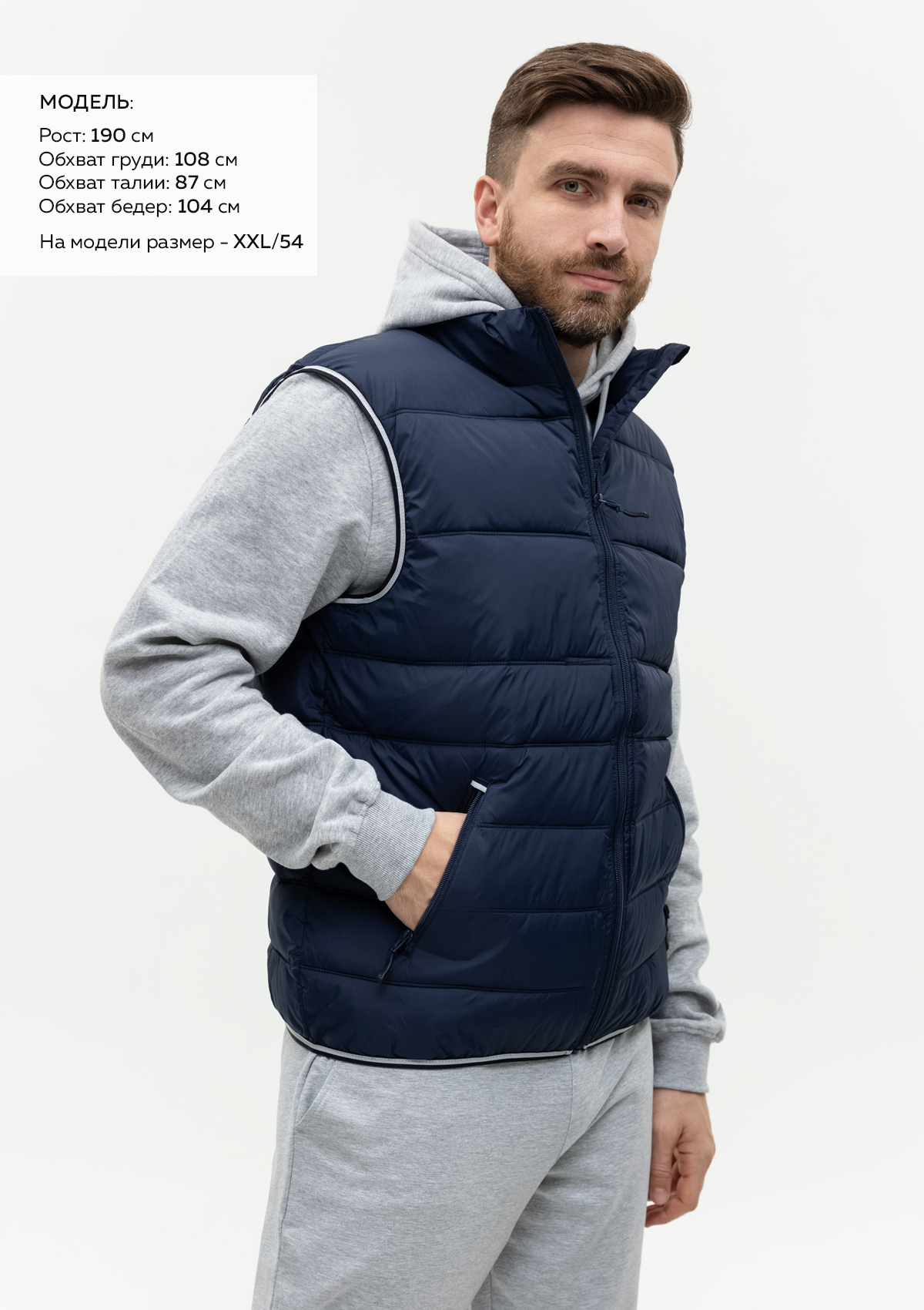 Размер на модели: XXL/54. Параметры модели: рост 190 см.; обхват груди 108 см.; обхват талии 87 см.; обхват бедер 104 см.
