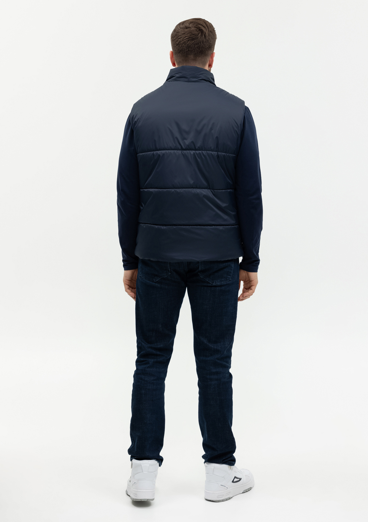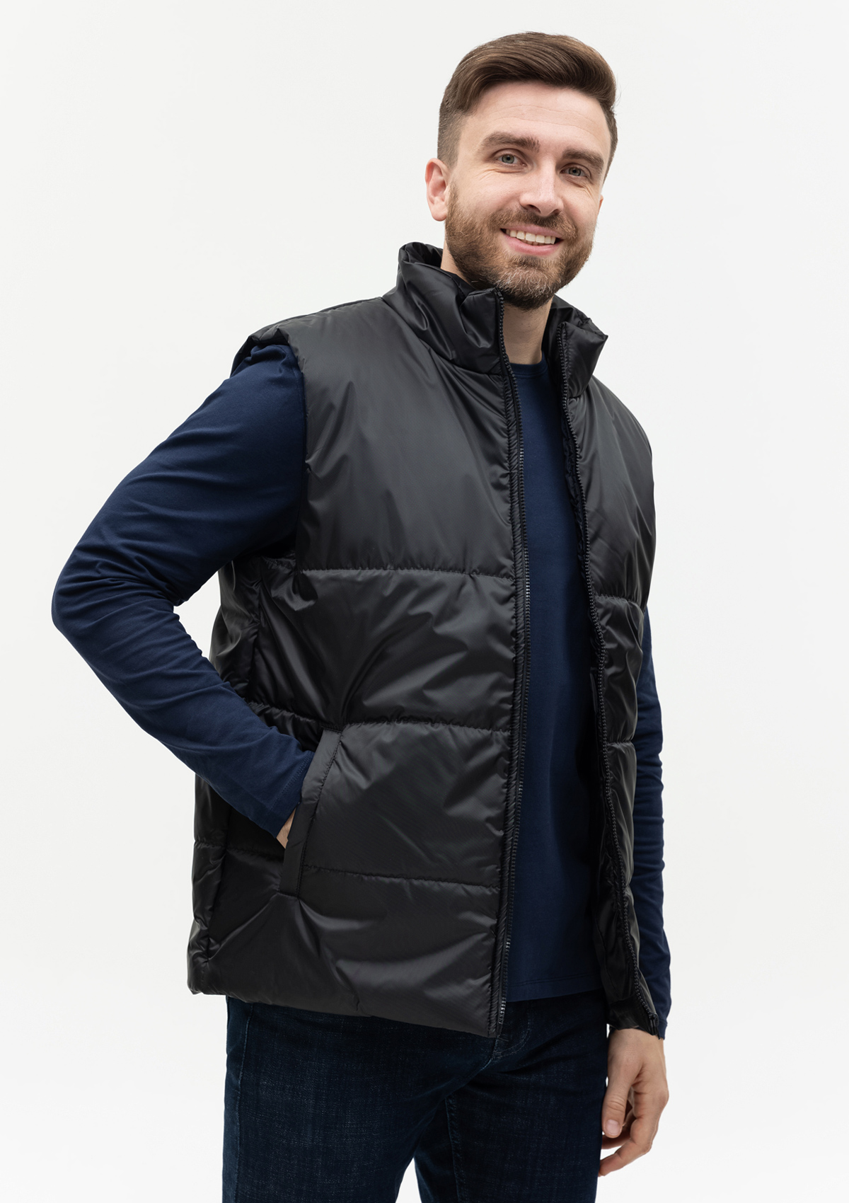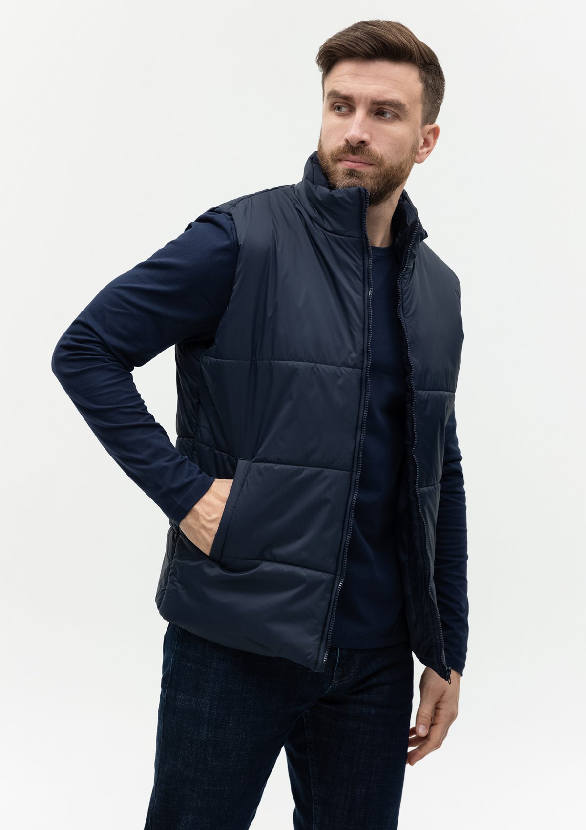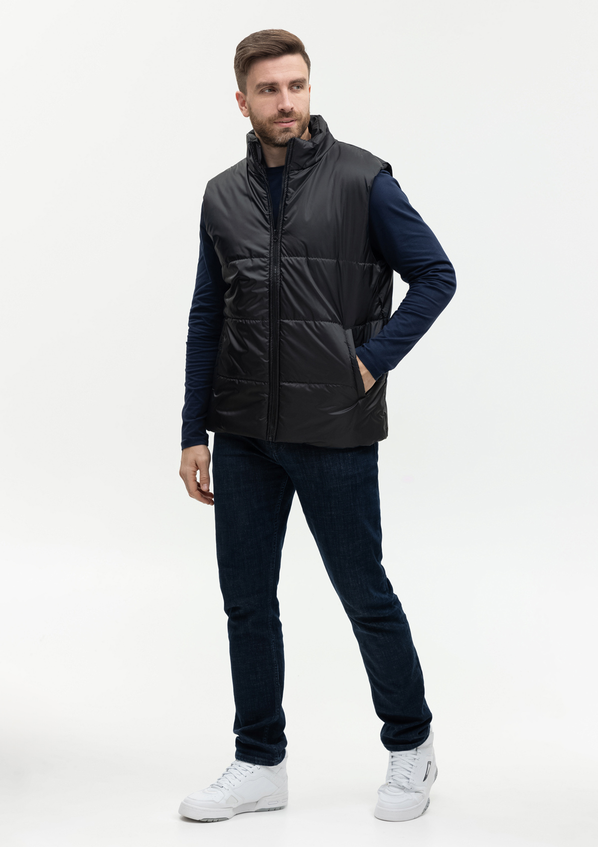 Универсальный жилет прямого силуэта с широкой горизонтальной стежкой, высоким воротником-стойкой, глубоким прорезным карманом и застежкой на молнию. Благодаря классическому лаконичному крою модель станет стильным дополнением как к мужскому, так и к женскому гардеробу.