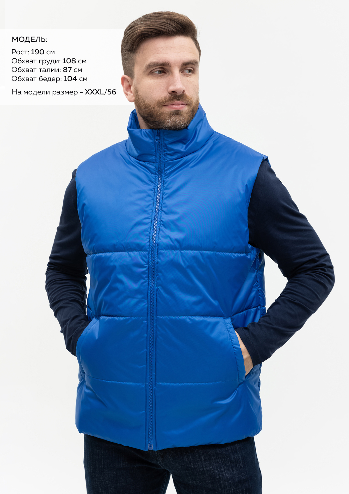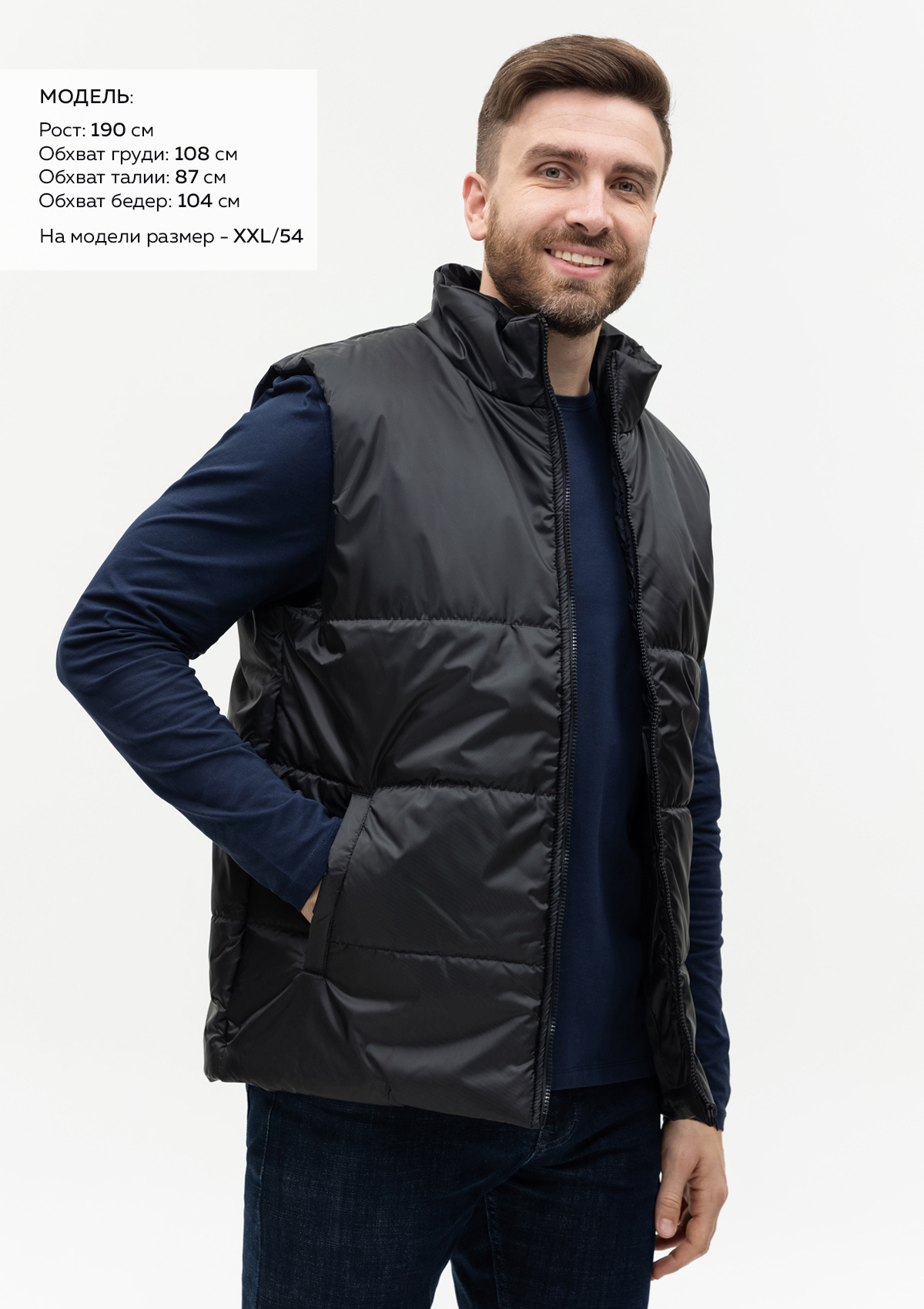 Размер мужского жилета: XXL/54. Параметры модели: рост 190 см.; обхват груди 108 см.; обхват талии 87 см.; обхват бедер 104 см.