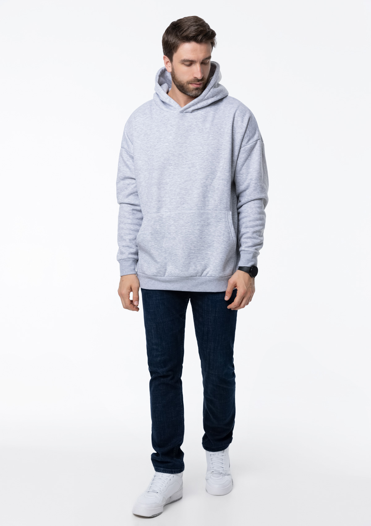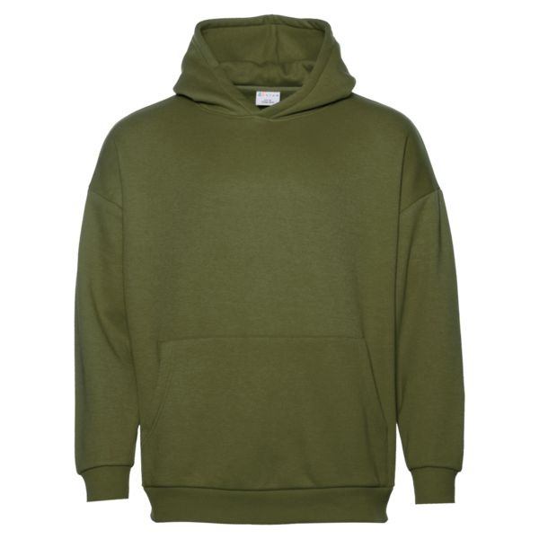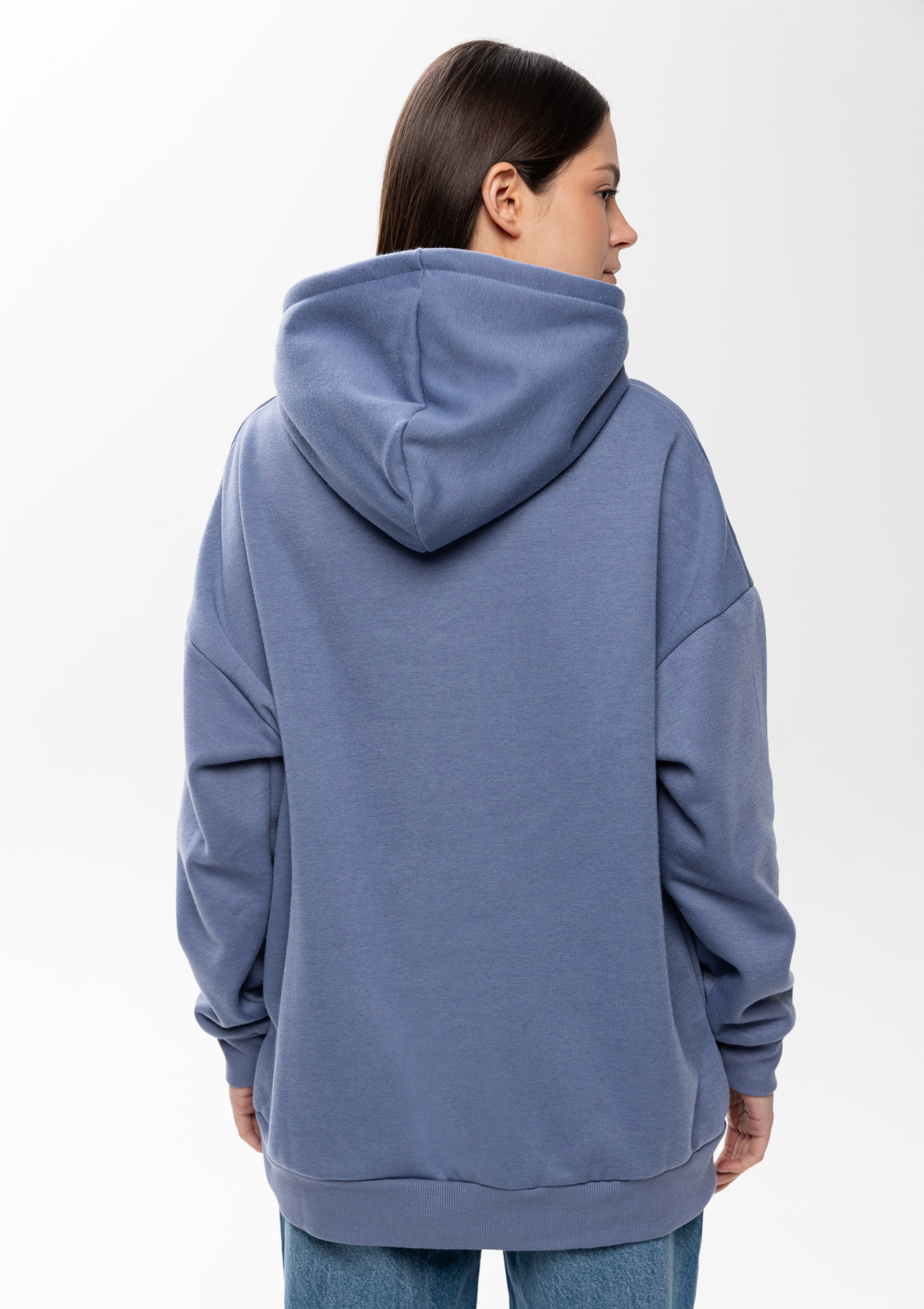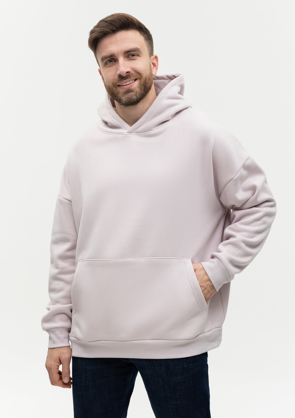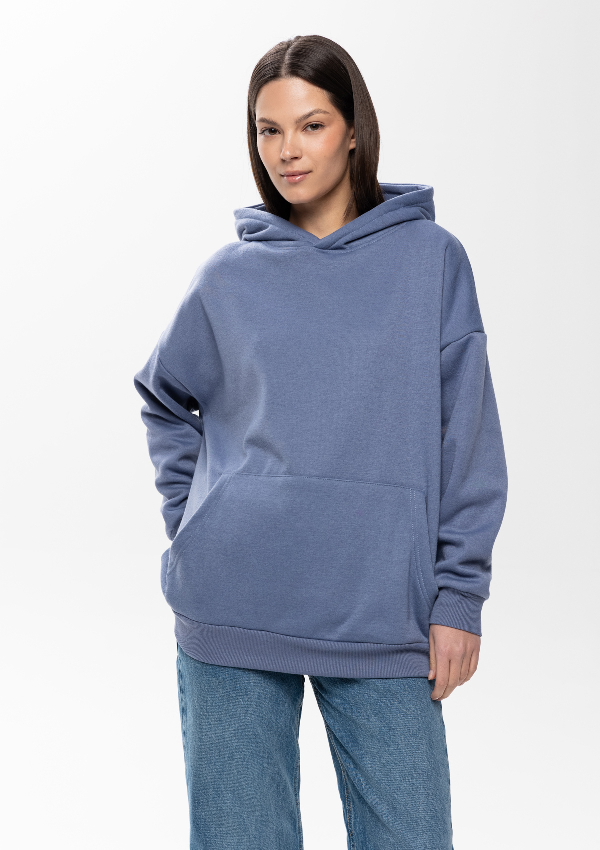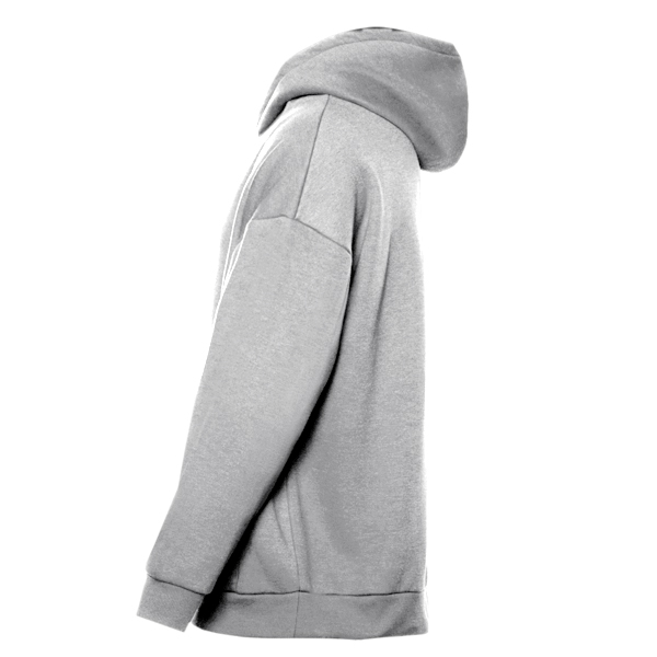 Толстовка свободного силуэта с капюшоном комфортной глубины, спущенной линией плеча и глубоким карманом-кенгуру. Манжет и низ изделия оформлены широкой эластичной резинкой в тон основному цвету.