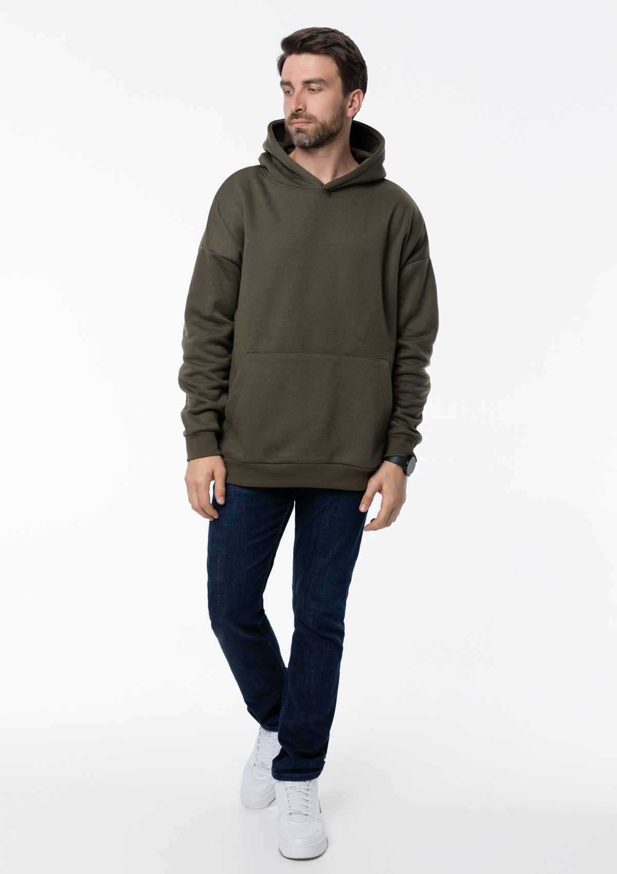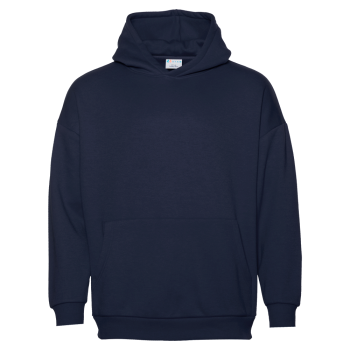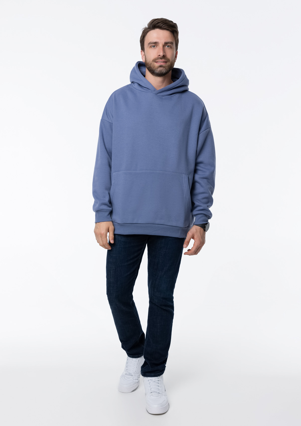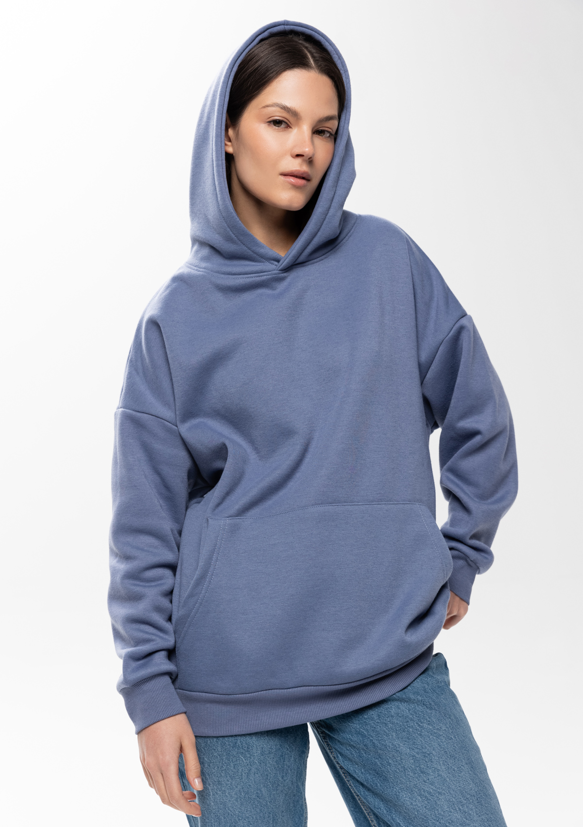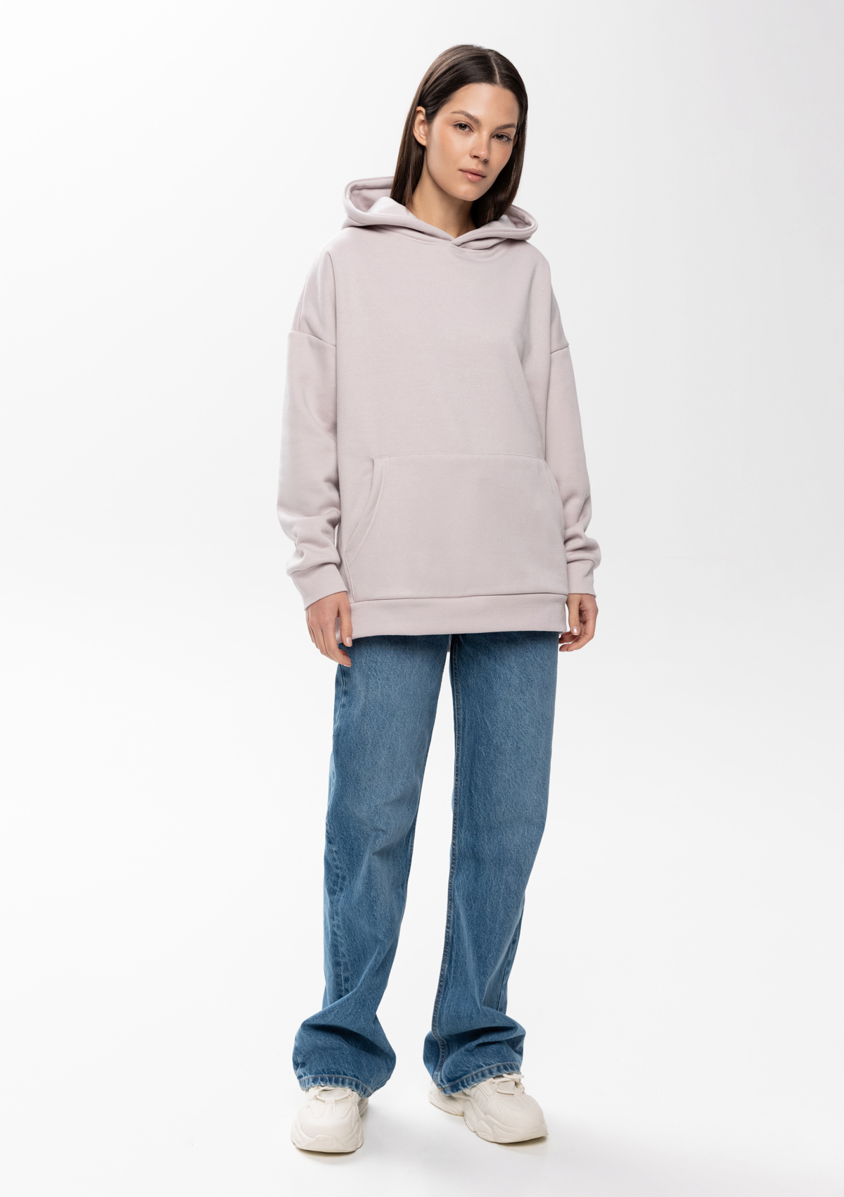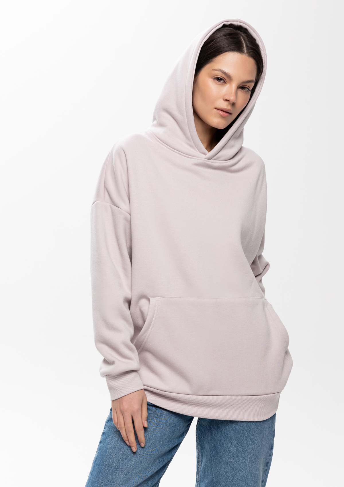 Толстовка свободного силуэта с капюшоном комфортной глубины, спущенной линией плеча и глубоким карманом-кенгуру. Манжет и низ изделия оформлены широкой эластичной резинкой в тон основному цвету.