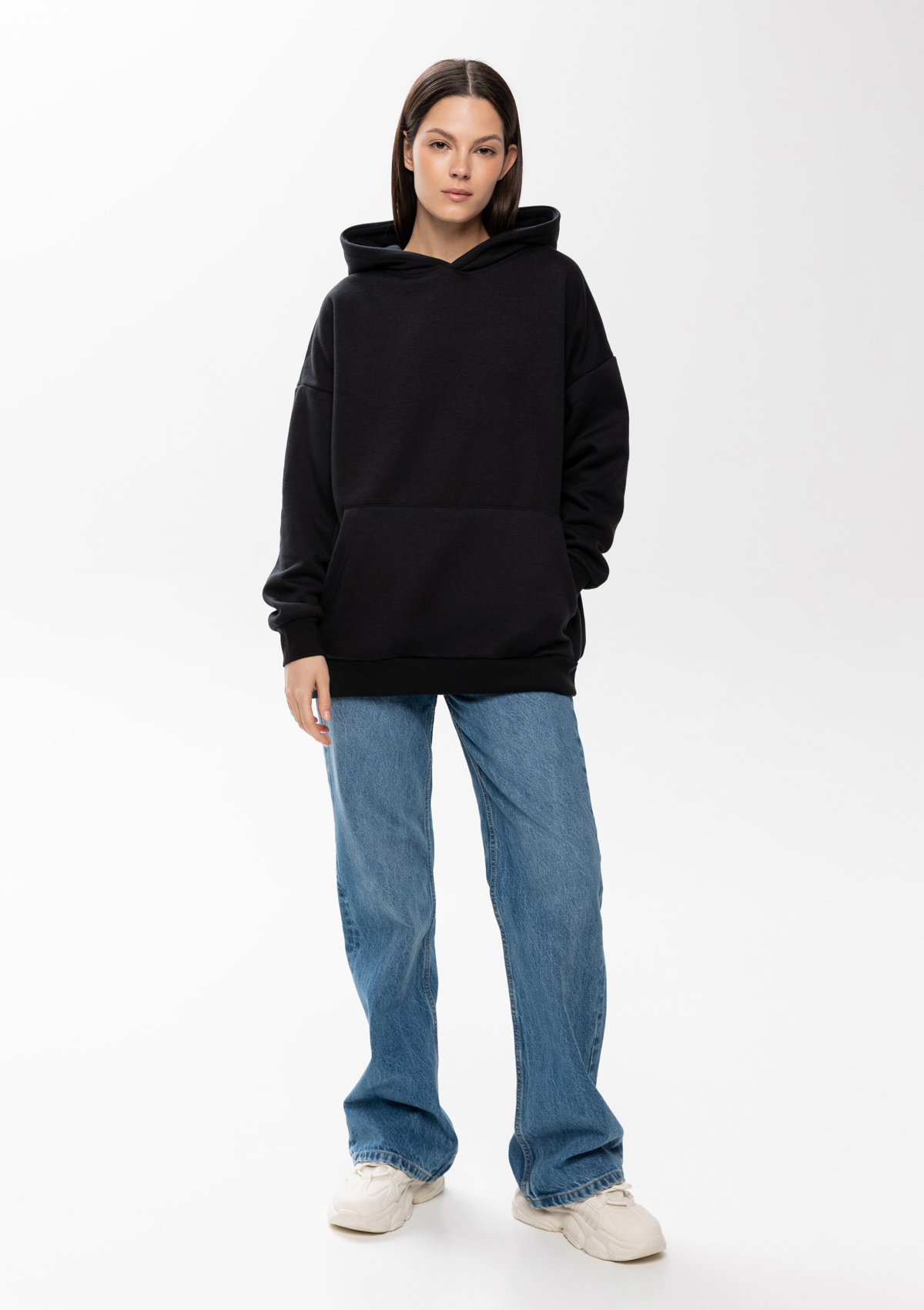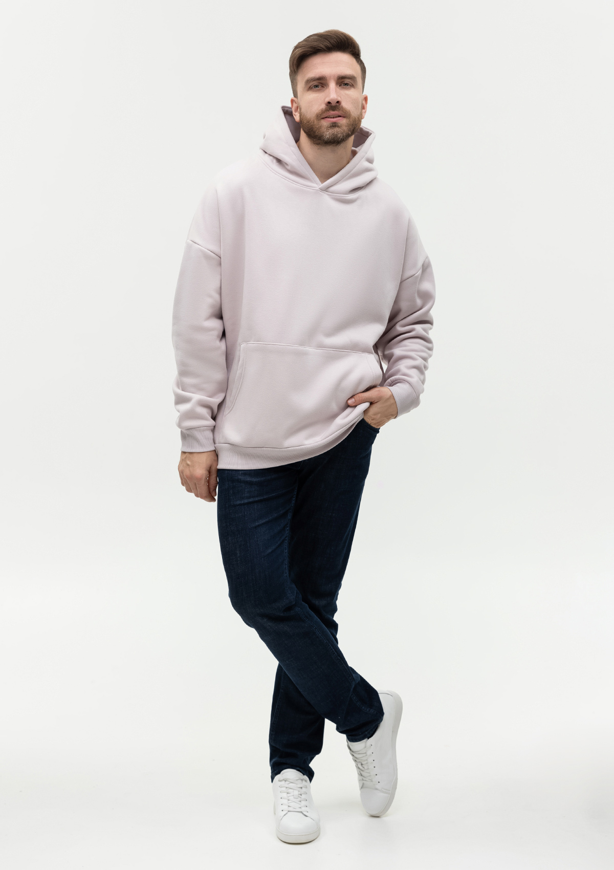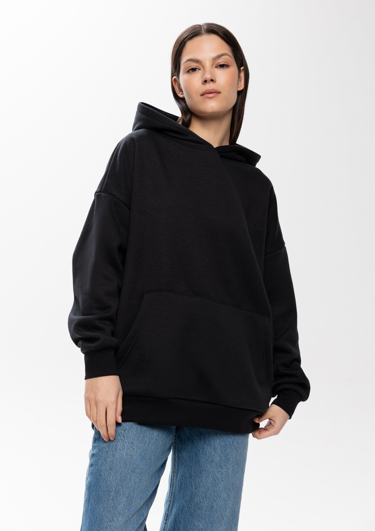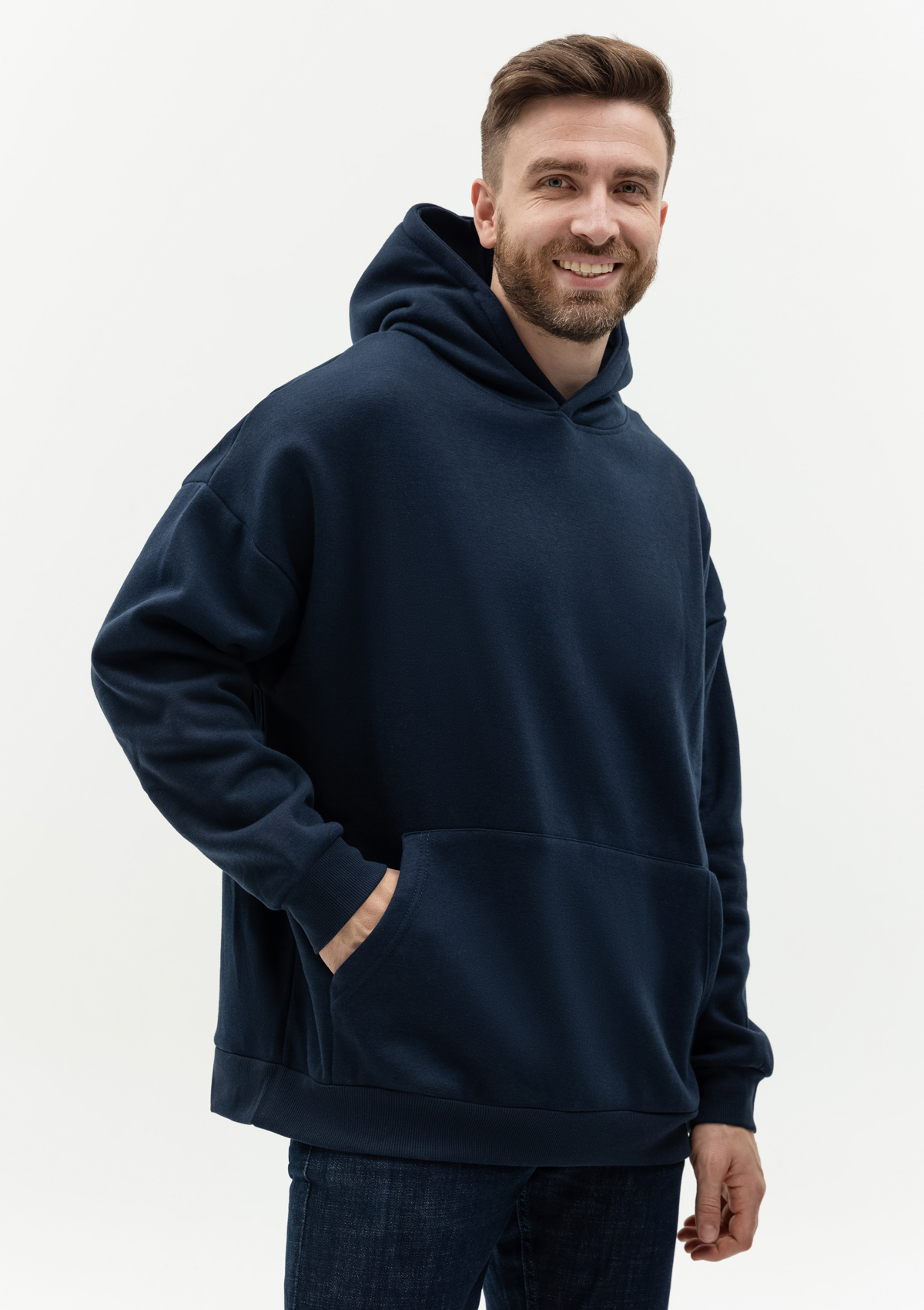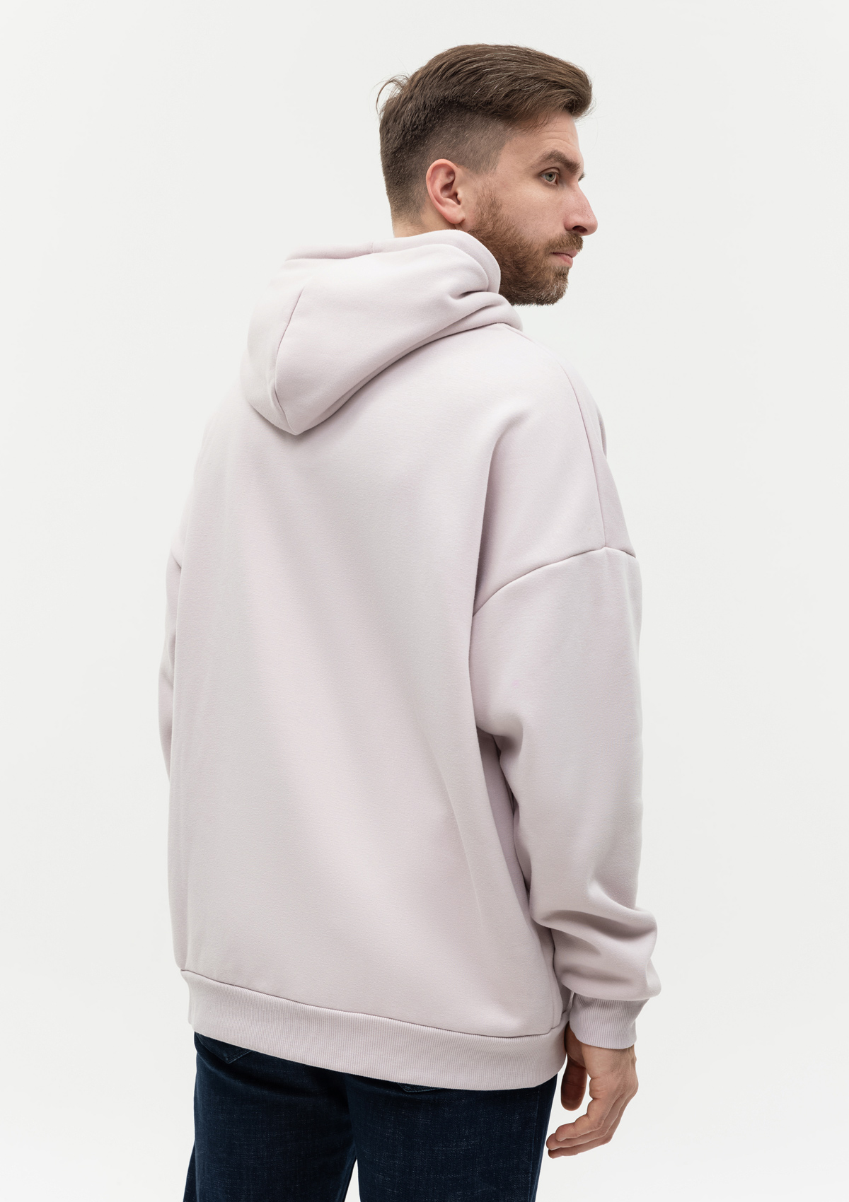 Толстовка свободного силуэта с капюшоном комфортной глубины, спущенной линией плеча и глубоким карманом-кенгуру. Манжет и низ изделия оформлены широкой эластичной резинкой в тон основному цвету.