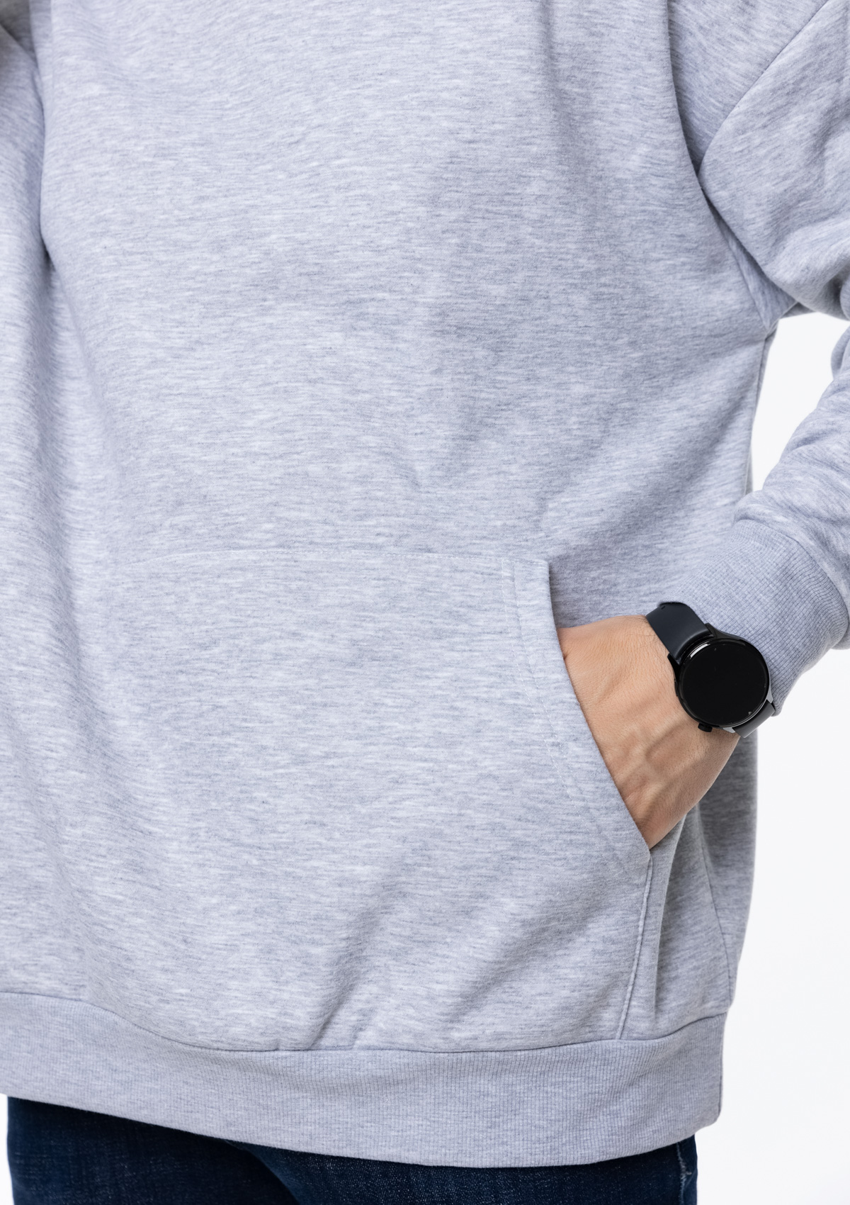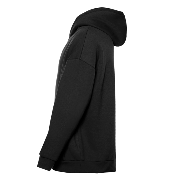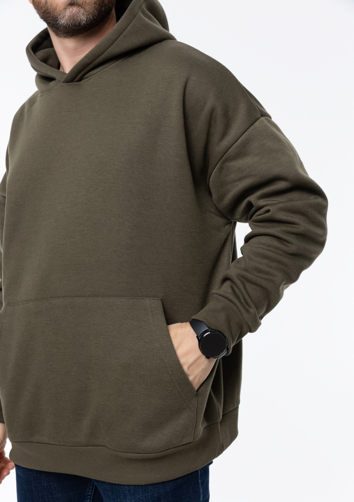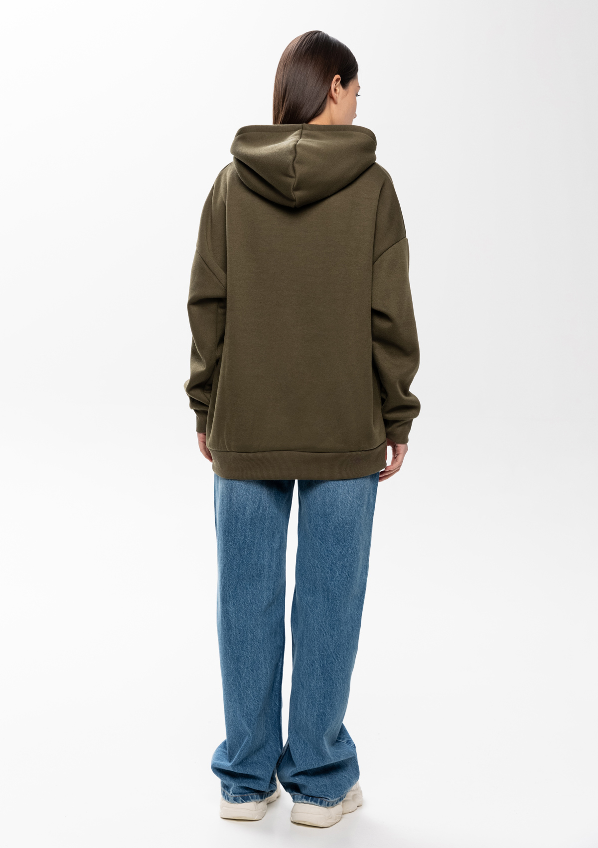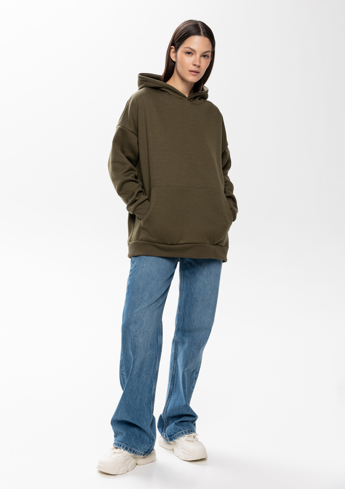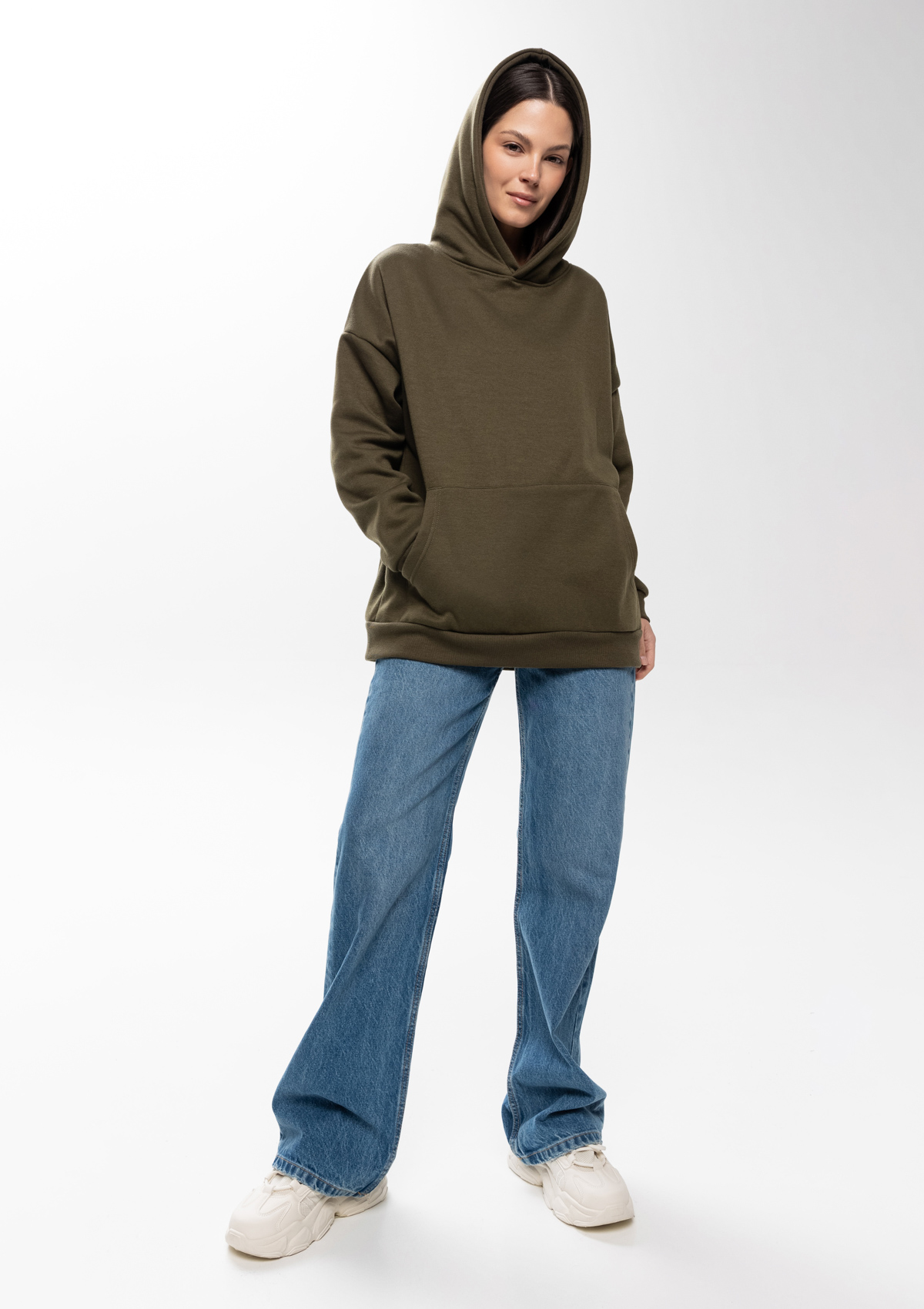 Толстовка свободного силуэта с капюшоном комфортной глубины, спущенной линией плеча и глубоким карманом-кенгуру. Манжет и низ изделия оформлены широкой эластичной резинкой в тон основному цвету.