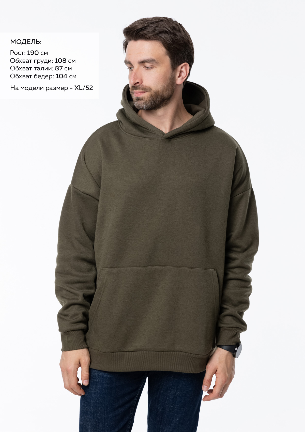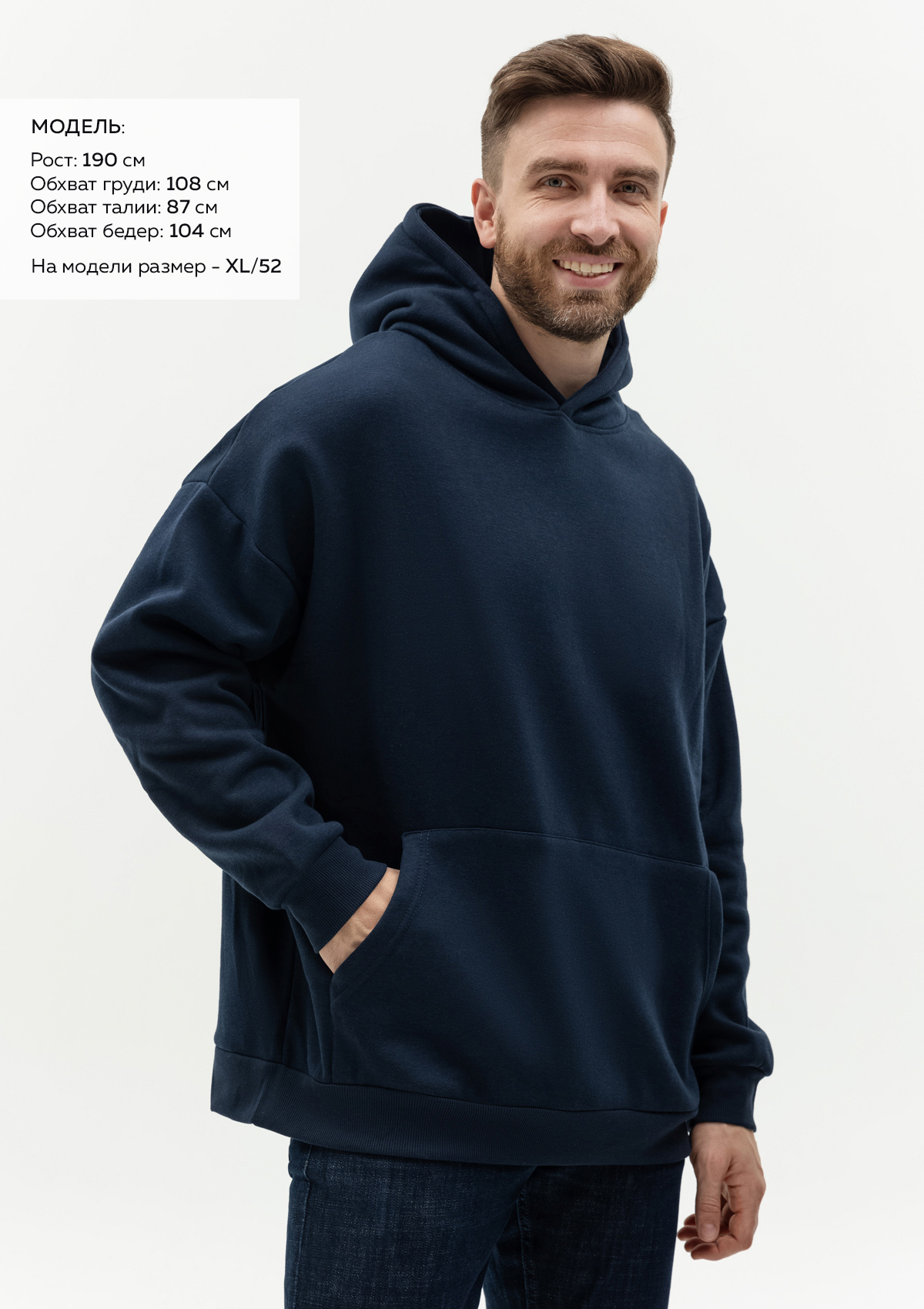 Размер мужского худи: XL/52. Параметры модели: рост 190 см.; обхват груди 108 см.; обхват талии 87 см.; обхват бедер 104 см.