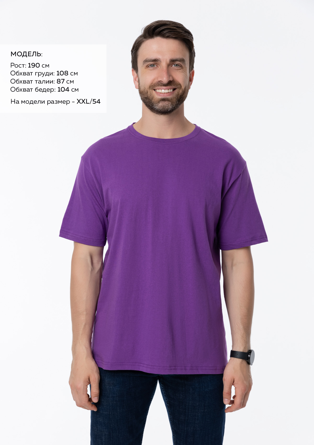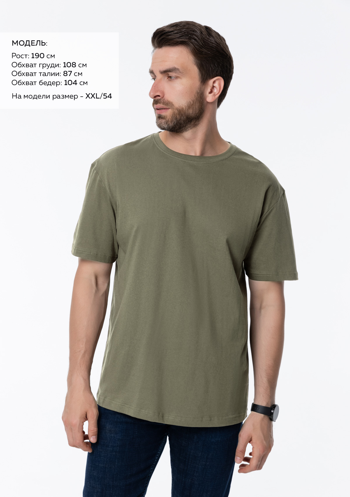 Размер мужской футболки: XXL/54. Параметры модели: рост 190 см.; обхват груди 108 см.; обхват талии 87 см.; обхват бедер 104 см.