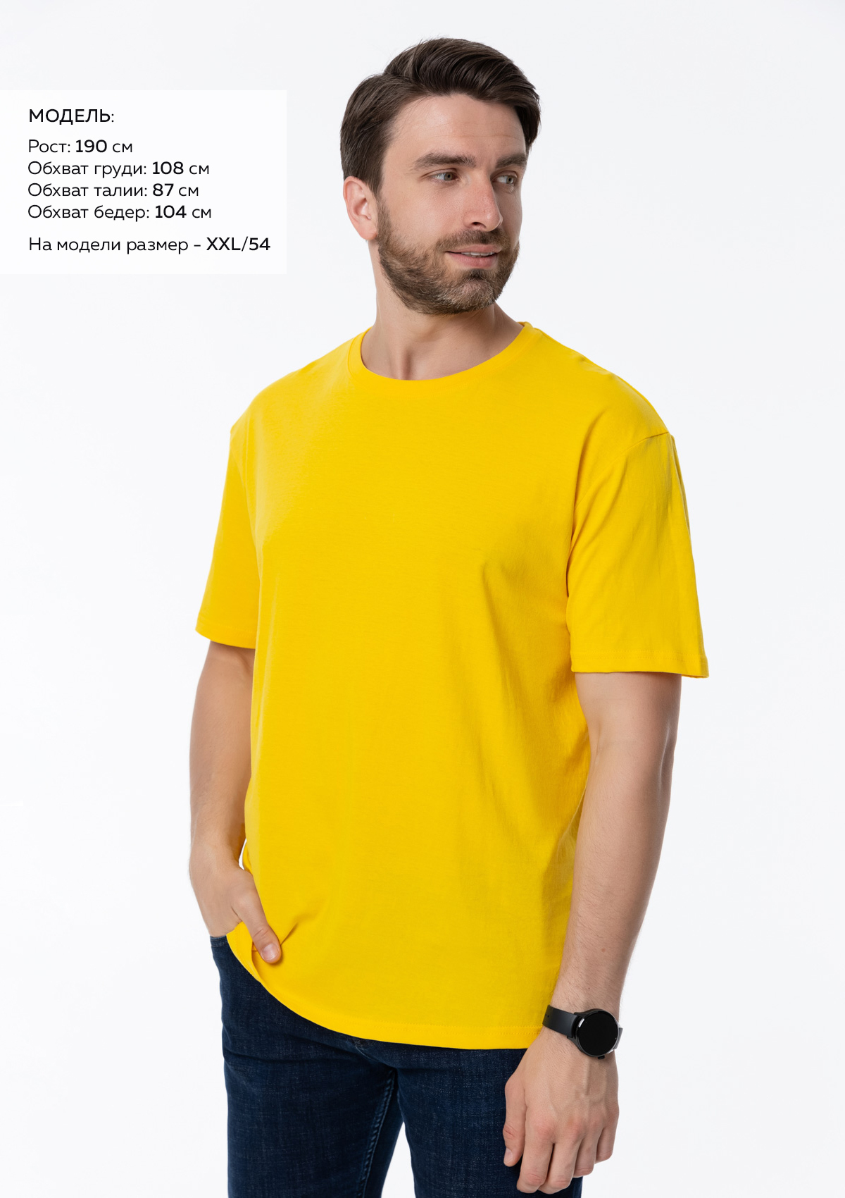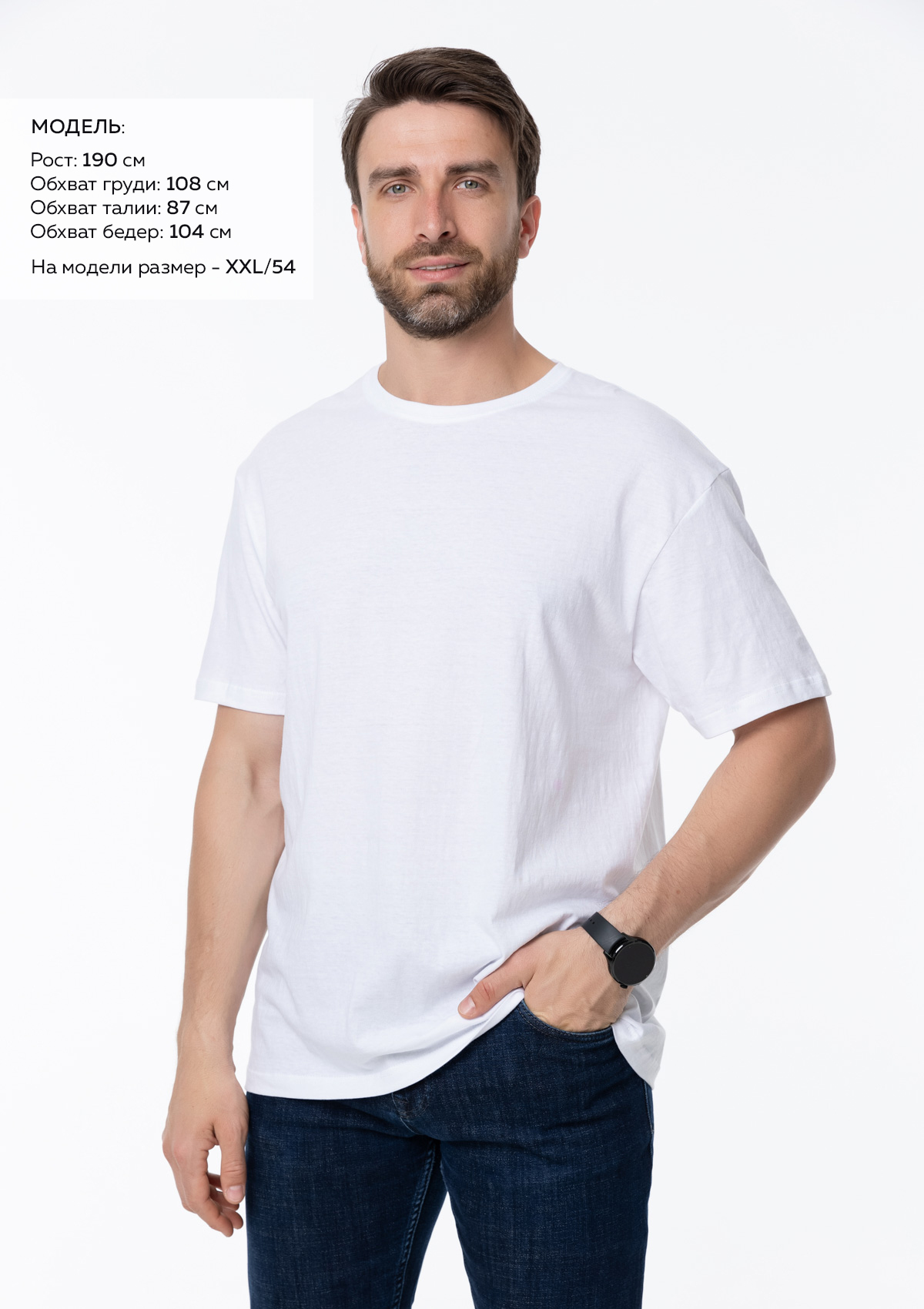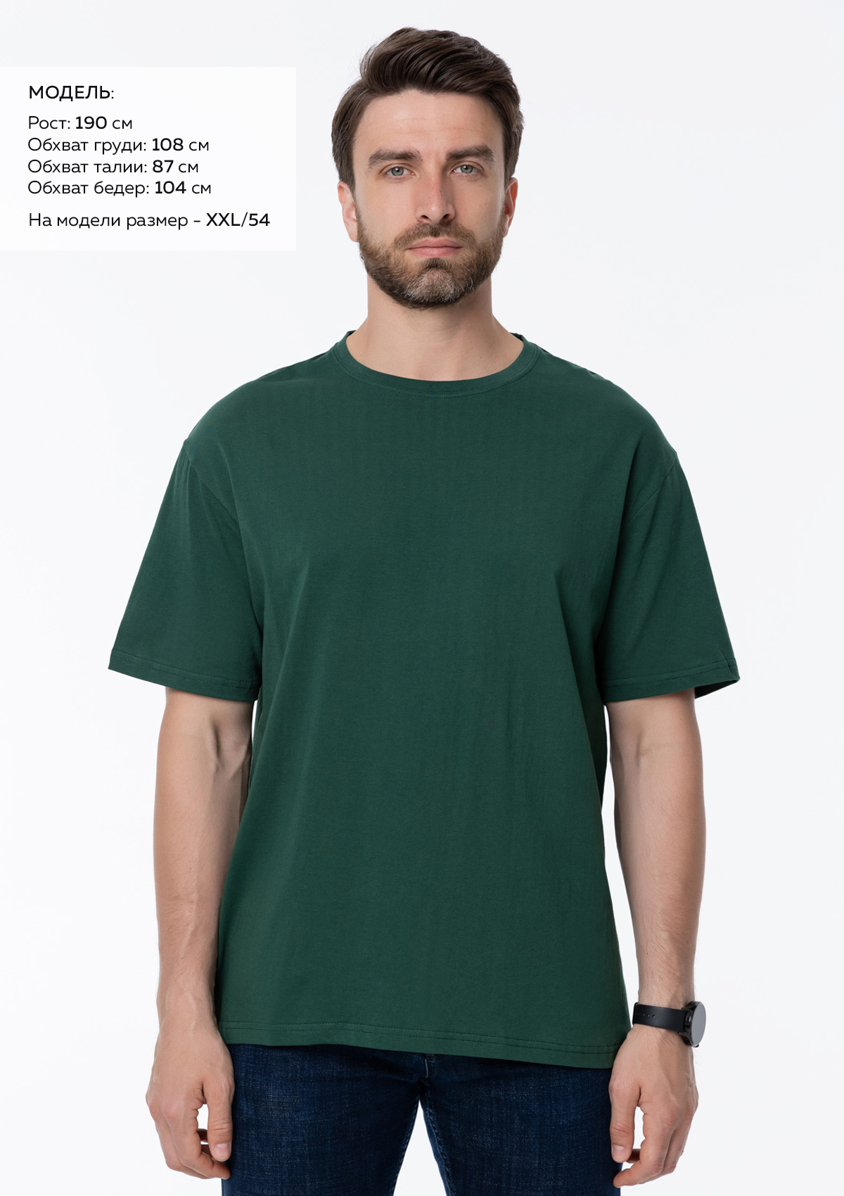 Размер мужской футболки: XXXL/56. Параметры модели: рост 190 см.; обхват груди 108 см.; обхват талии 87 см.; обхват бедер 104 см.