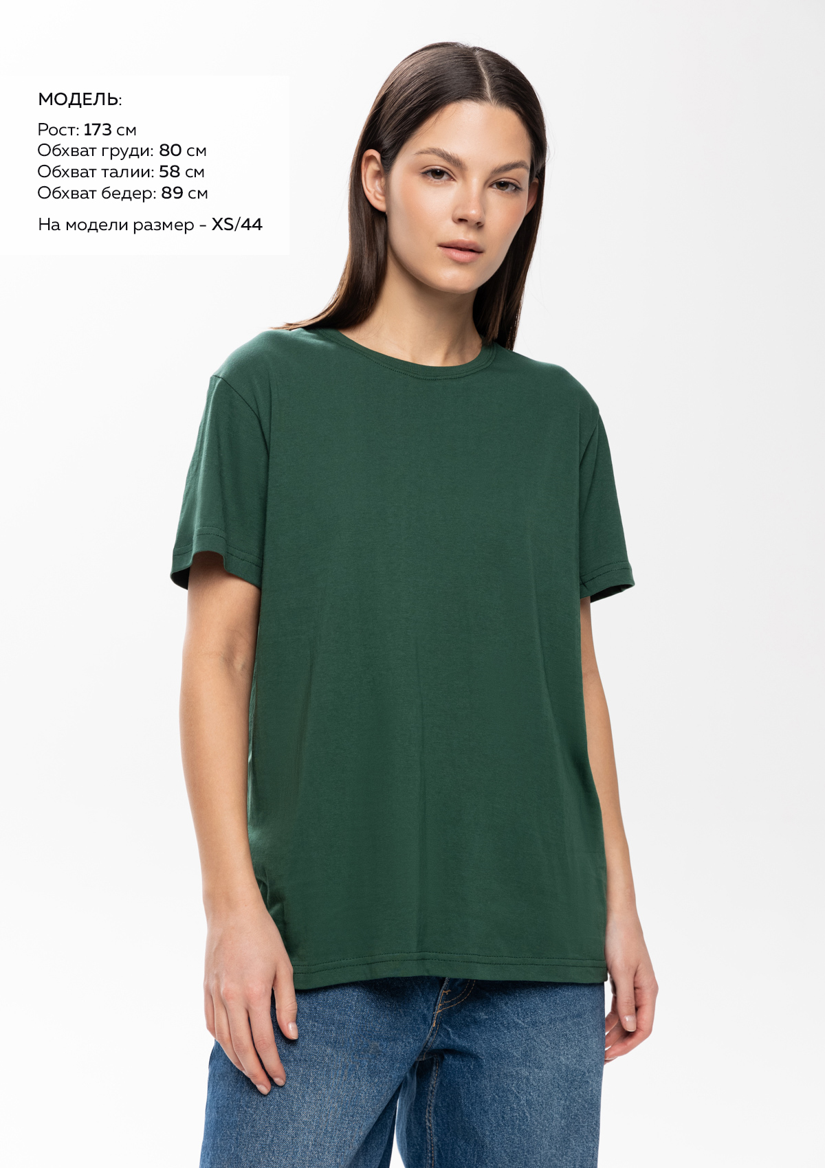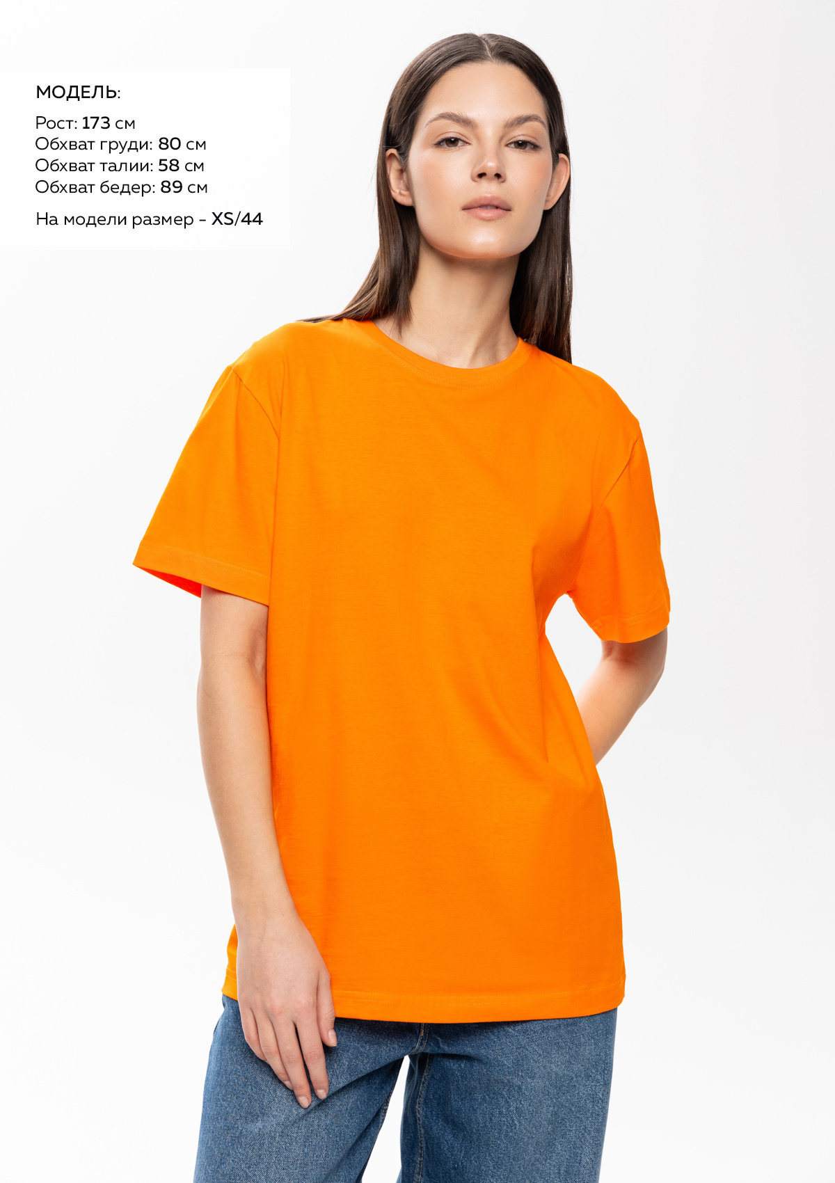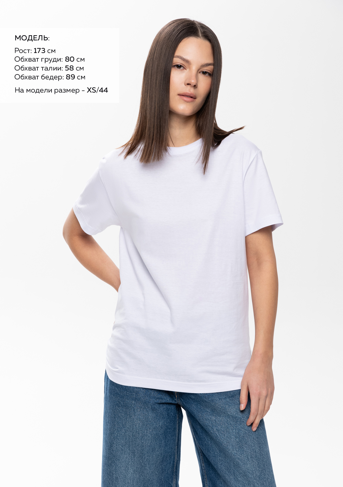 Размер женской футболки: XS/44. Параметры модели: рост 173 см.; обхват груди 80 см.; обхват талии 58 см.; обхват бедер 89 см.