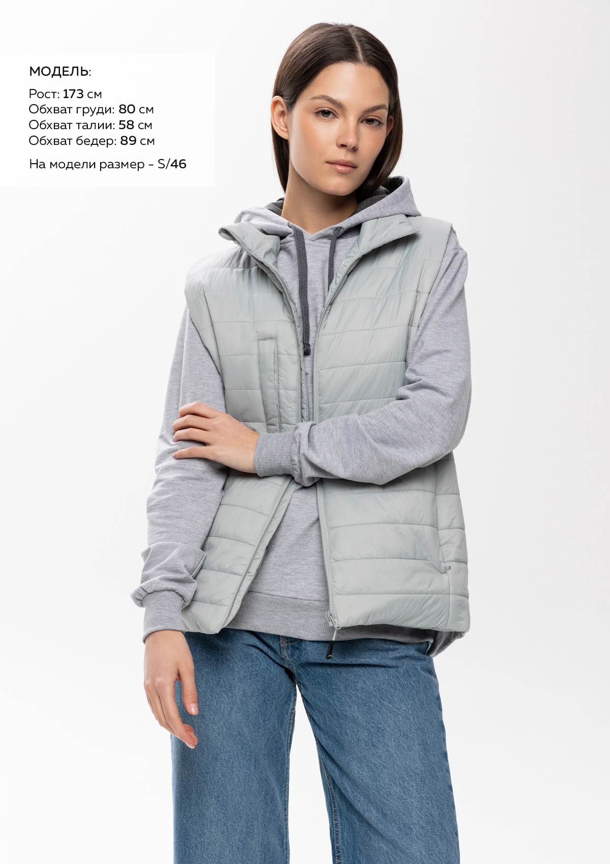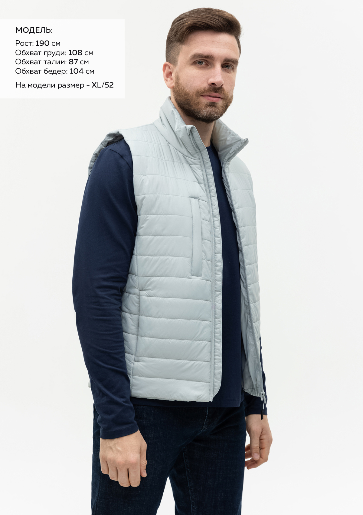 Ультралегкий жилет прямого силуэта с горизонтальной стежкой, воротником-стойкой, функциональным карманом по правой полочке, прорезным карманом и застежкой на молнию с внутренней ветрозащитной планкой. В комплекте прилагается сумка-чехол (технологии нанесения: шелкотрансфер и ДТФ-печать).
